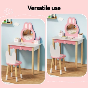 Inspire magical play times with Keezi's Bunny Ear Dressing Table Set. Featuring an adorable rabbit-ear silhouette with detachable mirror, this MDF-and-pinewood vanity grows with your child. The 30kg-capacity table pairs with a 50kg-rated stool, both finished in dreamy pink with safety-rounded edges. Easy-to-clean surfaces withstand makeup play, while the pinewood legs ensure lasting stability.