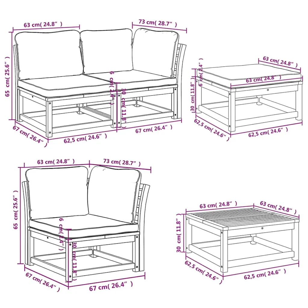 This wooden garden lounge set with cushions has an elegant design and is a great choice for relaxing and enjoying in the garden or patio. Solid acacia wood: Solid acacia wood is a beautiful natural material. Acacia wood is a tropical hardwood, which is dense, sturdy, and durable.Comfortable seat experience: The backrest and the thickly-padded cushions make the garden sofa set more comfortable to sit on.Slatted design: The slatted design of the wooden lounge set effectively prevents water from pooling, ensuring that the seat remains dry and free from potential rot.Modular design: This outdoor furniture set has a modular design, making it completely flexible and easy to move around, so you can create a customised outdoor furniture arrangement. Good to know:To make sure your outdoor furniture stays beautiful, we recommend protecting it with a waterproof cover.