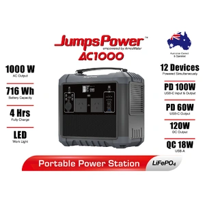 Introducing the JumpsPower AC1000 Portable Power Station, an Australian-owned marvel of modern technology designed to keep you powered in any setting. Its formidable 1000W AC output and 716.8Wh battery capacity make it a powerhouse, capable of charging up to 12 devices simultaneously.