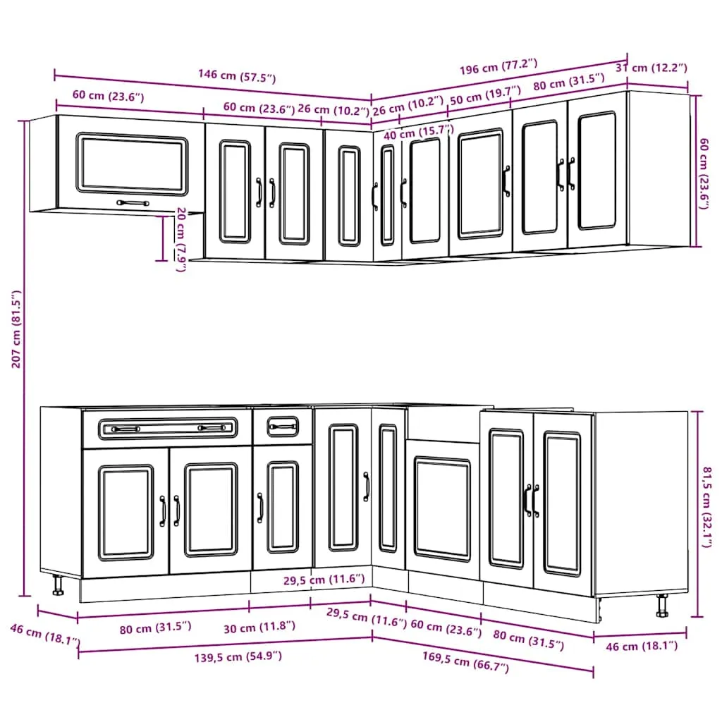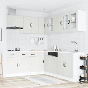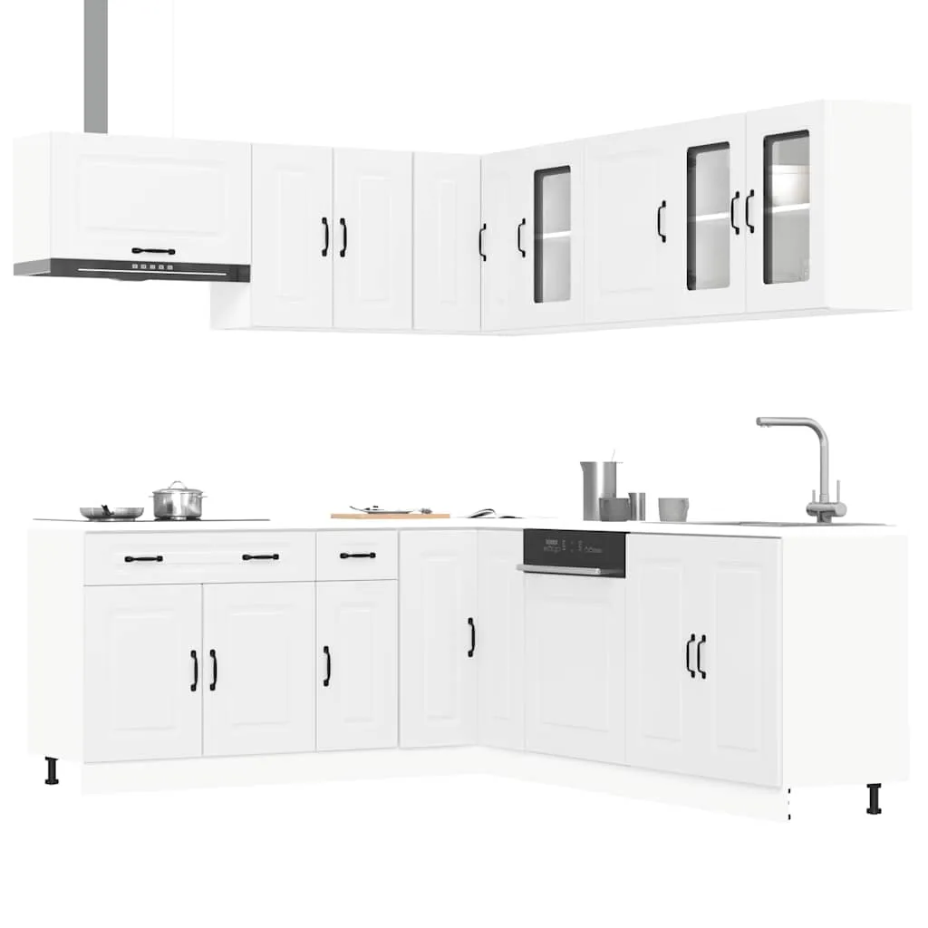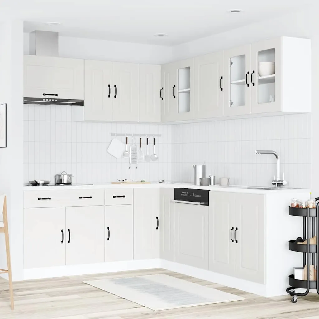 This 11-piece kitchen cabinet set, with its elegant design, optimises your kitchen space and provides ample storage space for your personal belongings! Stable and durable material: Engineered wood is a durable and stable material with a smooth surface that is resistant to moisture, warping, and splitting, making it a reliable choice for a variety of projects.Ample storage space: The kitchen cabinet set has many compartments, and offers sufficient space to store bowls, plates, pots, and other kitchen appliances.Adjustable feet: The bottom cabinets feature adjustable feet that can be adjusted in height to suit your kitchen layout.Easy to maintain: Thanks to its smooth surface, these kitchen cabinets are easy to clean with a damp cloth and require less maintenance. Warning:To prevent it from tipping over, this product must be used with the provided wall attachment device. Good to know:Screw(s) and plug(s) for inside the wall are not included. Seek and use screw(s) and plug(s) suitable for your walls. If you are uncertain, seek professional advice. Read and follow each step of the instruction carefully.The worktop, sink and faucet are not included in the delivery.
