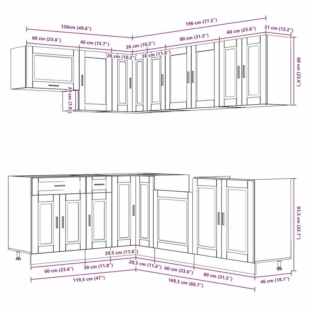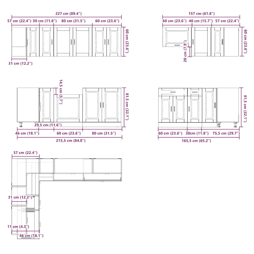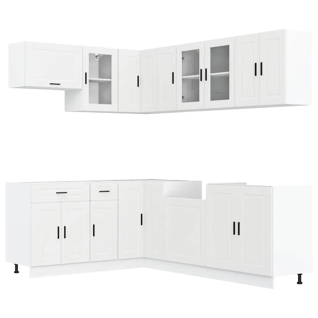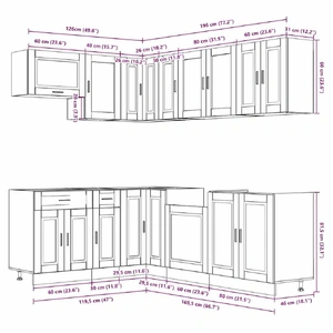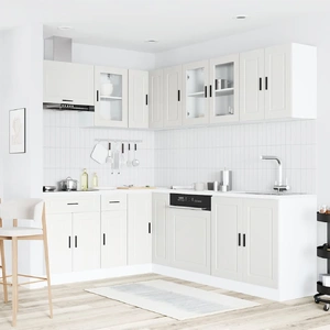 This 11-piece kitchen cabinet set, with its elegant design, optimises your kitchen space and provides ample storage space for your personal belongings! Stable and durable material: Engineered wood is a durable and stable material with a smooth surface that is resistant to moisture, warping, and splitting, making it a reliable choice for a variety of projects.Ample storage space: The kitchen cabinet set has many compartments, and offers sufficient space to store bowls, plates, pots, and other kitchen appliances.Adjustable feet: The bottom cabinets feature adjustable feet that can be adjusted in height to suit your kitchen layout.Easy to maintain: Thanks to its smooth surface, these kitchen cabinets are easy to clean with a damp cloth and require less maintenance. Warning:To prevent it from tipping over, this product must be used with the provided wall attachment device. Good to know:Screw(s) and plug(s) for inside the wall are not included. Seek and use screw(s) and plug(s) suitable for your walls. If you are uncertain, seek professional advice. Read and follow each step of the instruction carefully.The worktop, sink and faucet are not included in the delivery.