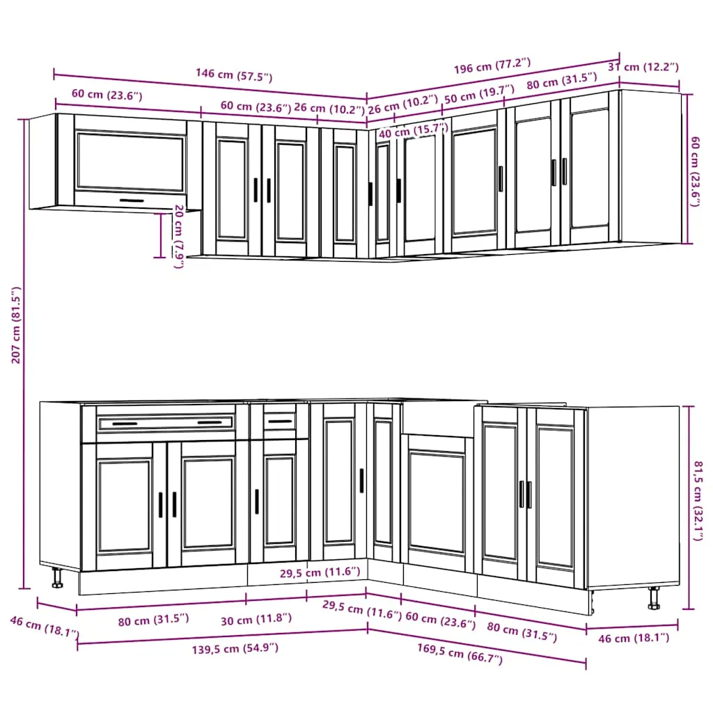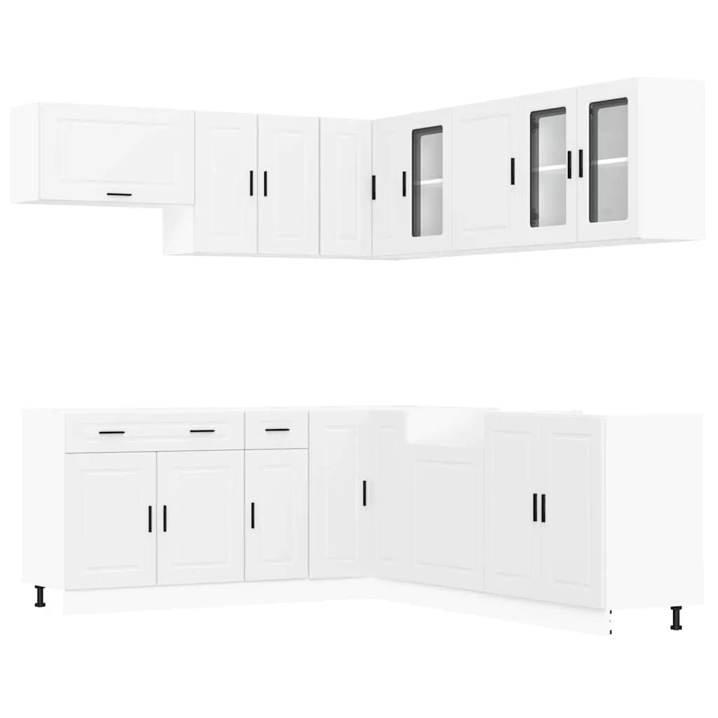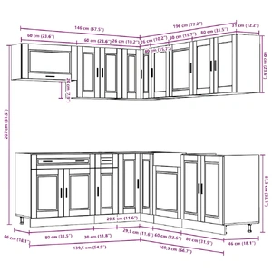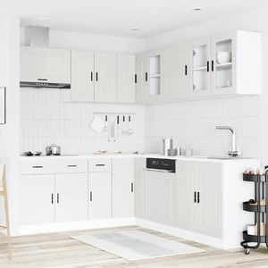 This 11-piece kitchen cabinet set, with its elegant design, optimises your kitchen space and provides ample storage space for your personal belongings! Stable and durable material: Engineered wood is a durable and stable material with a smooth surface that is resistant to moisture, warping, and splitting, making it a reliable choice for a variety of projects.Ample storage space: The kitchen cabinet set has many compartments, and offers sufficient space to store bowls, plates, pots, and other kitchen appliances.Adjustable feet: The bottom cabinets feature adjustable feet that can be adjusted in height to suit your kitchen layout.Easy to maintain: Thanks to its smooth surface, these kitchen cabinets are easy to clean with a damp cloth and require less maintenance. Warning:To prevent it from tipping over, this product must be used with the provided wall attachment device. Good to know:Screw(s) and plug(s) for inside the wall are not included. Seek and use screw(s) and plug(s) suitable for your walls. If you are uncertain, seek professional advice. Read and follow each step of the instruction carefully.The worktop, sink and faucet are not included in the delivery.