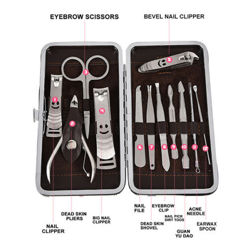 12Pcs manicure pedicure kit: Includes toenail clipper, nail clipper, diagonal nail clipper, multi-purpose scissor, cuticle trimmer, ear pick, single-edged double-sided push stick, eyebrow tweezer, peeling knife, nail file, blackhead needle and loop remover, V-shaped push Stick.