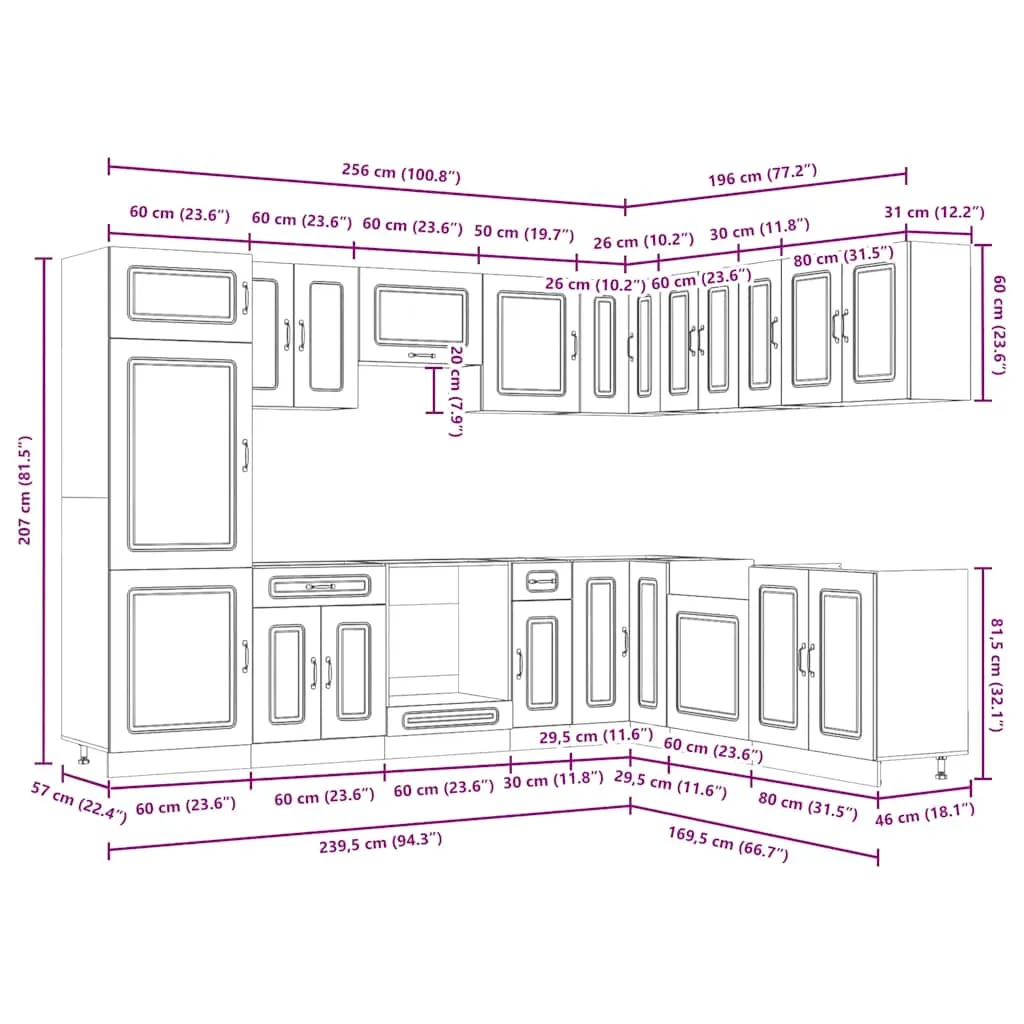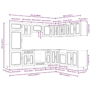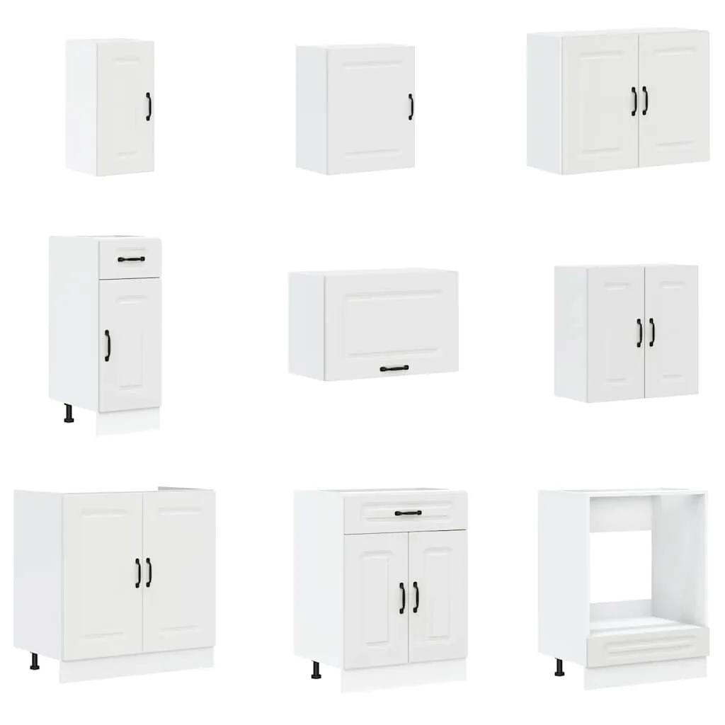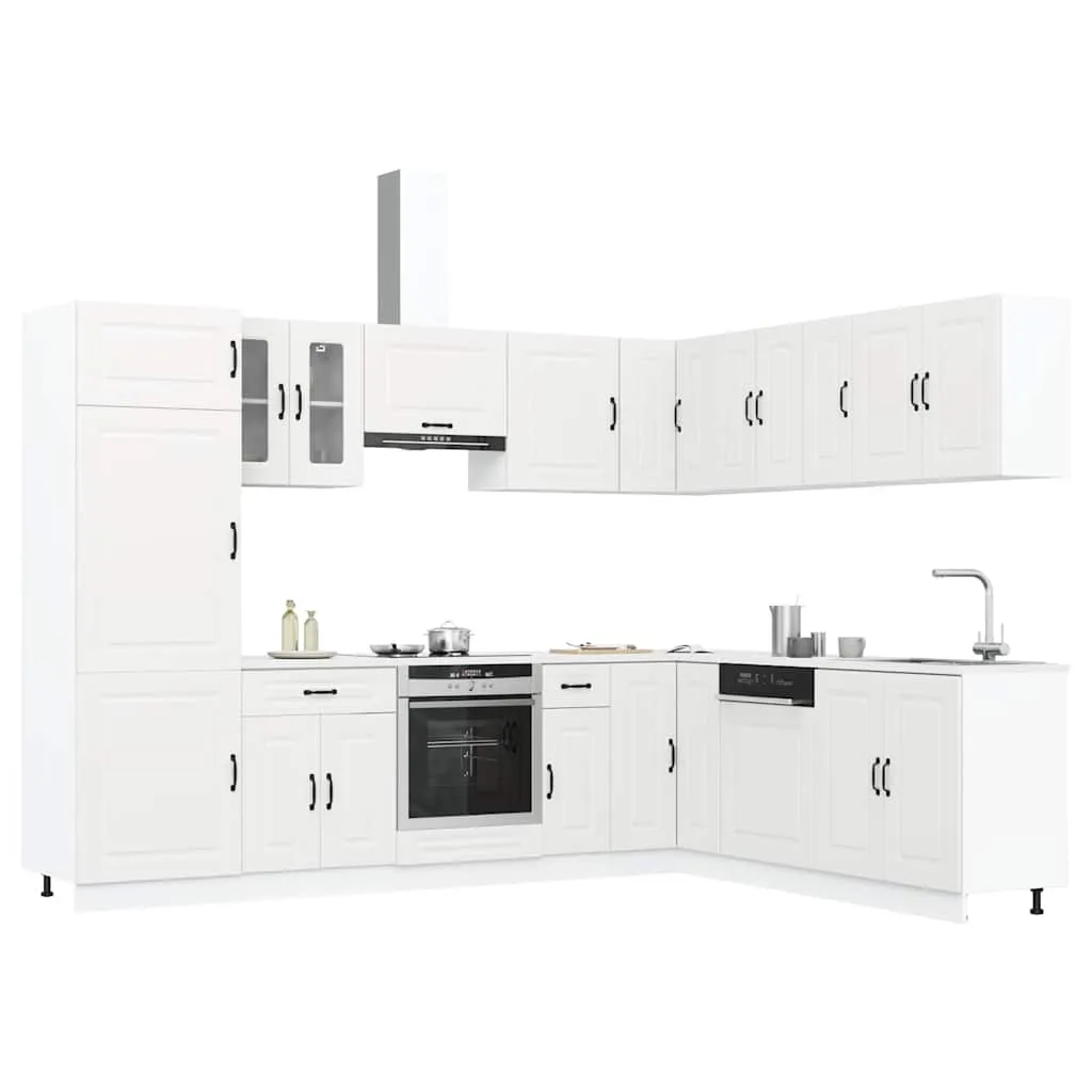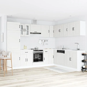 This 14-piece kitchen cabinet set, with its elegant design, optimises your kitchen space and provides ample storage space for your personal belongings! Stable and durable material: Engineered wood is a durable and stable material with a smooth surface that is resistant to moisture, warping, and splitting, making it a reliable choice for a variety of projects.Ample storage space: The kitchen cabinet set has many compartments, and offers sufficient space to store bowls, plates, pots, and other kitchen appliances.Adjustable feet: The bottom cabinets feature adjustable feet that can be adjusted in height to suit your kitchen layout.Easy to maintain: Thanks to its smooth surface, these kitchen cabinets are easy to clean with a damp cloth and require less maintenance. Warning:To prevent it from tipping over, this product must be used with the provided wall attachment device. Good to know:Screw(s) and plug(s) for inside the wall are not included. Seek and use screw(s) and plug(s) suitable for your walls. If you are uncertain, seek professional advice. Read and follow each step of the instruction carefully.The worktop, sink and faucet are not included in the delivery.