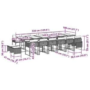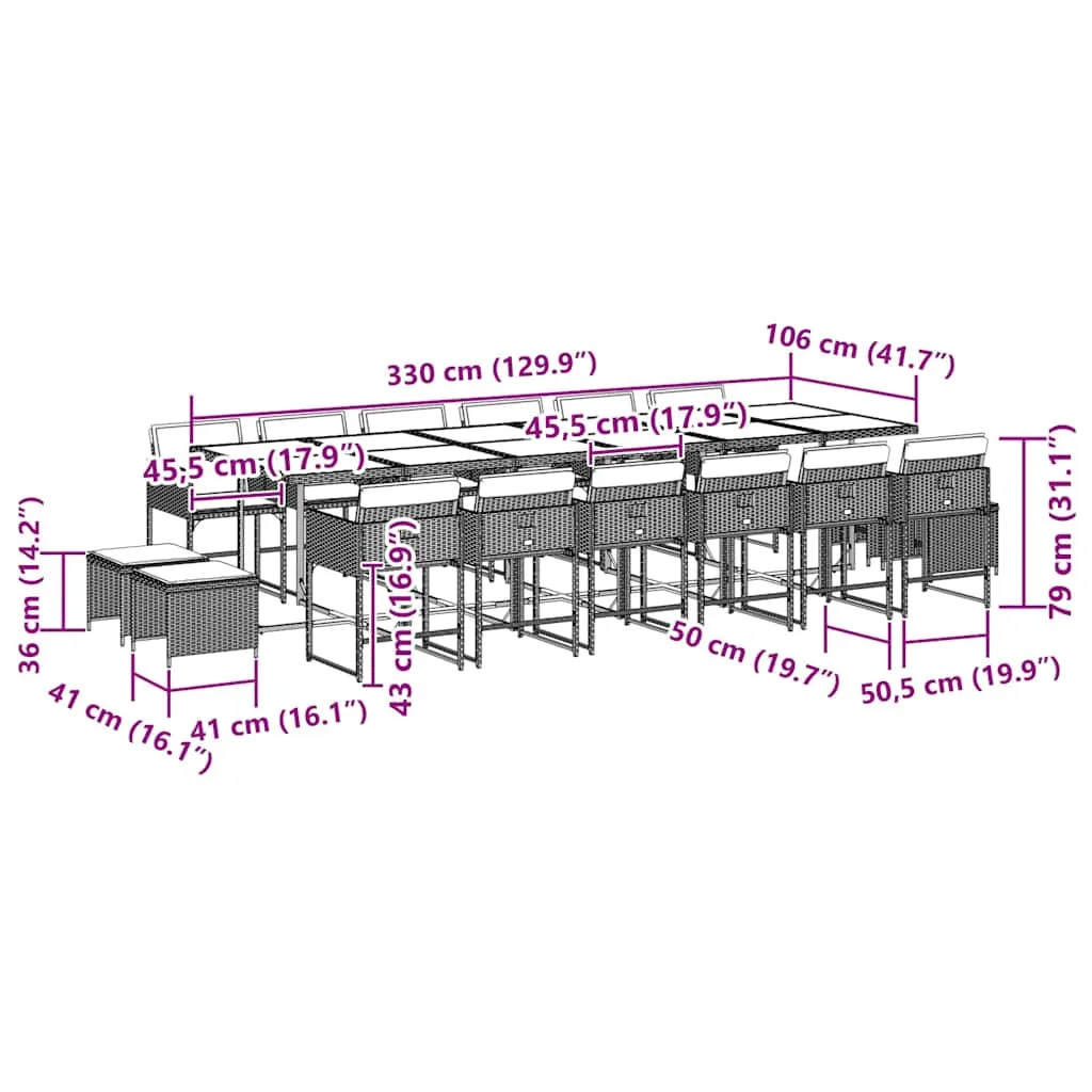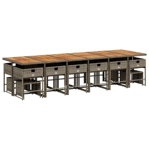 This garden dining set is a great choice for al fresco dining or just relaxing in the garden, backyard, or on the patio. Durable material: PE rattan, also known as poly rattan, is a strong, low-maintenance synthetic material that looks like natural rattan. It's lightweight, easy to clean, and commonly used for outdoor furniture due to its durability and weather-resistant properties.Compact storage: These chairs have a flap backrest that can be folded down, making it easy to store them under the table. When folded, they neatly fit under the table, forming a space-saving cube shape. Additionally, the stools can also be stored under the chairs, further maximising space efficiency.Comfortable seat experience: This outdoor furniture, complete with thickly padded cushions, offers a comfortable seating experience.Removable and washable cover: These seat cushions feature removable covers for easy washing and maintenance. The cushion covers have a flap at the back for easy attachment to the backrests.Stable and easy-to-clean tabletop: This garden table has an acacia wood top that is sturdy, durable, and easy to clean with a damp cloth. Good to know: To make sure your outdoor furniture stays beautiful, we recommend protecting it with a waterproof cover.