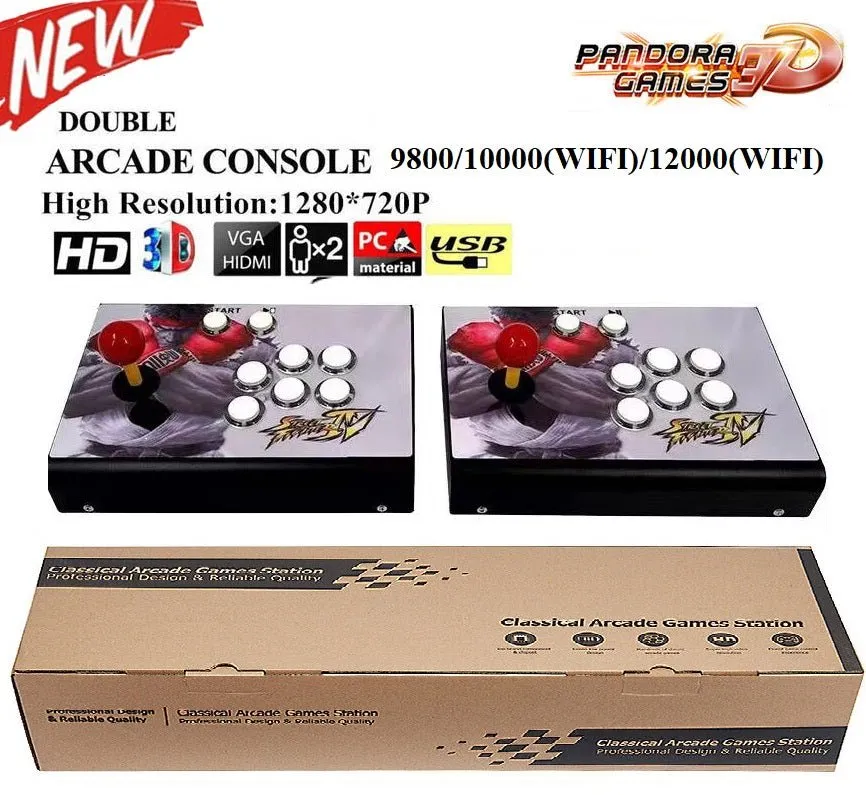 Slim Metal Double Stick Arcade Game Console - 10000/9800 Classic Games - 2 Players Pandora + Plus Support Extension VGA HDMI Output. You can connect it to the screen or TV via the VGA cable or HDMI cable, Just plug in and play! Our 10000/9800 in 1 Arcade Game Console offers Top ranking game control experience as well as stable performance.