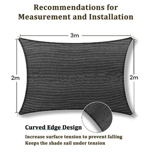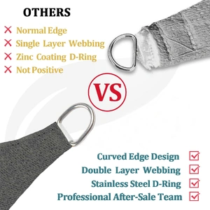 This sun shade is designed with curved edges to maximum tension; Every corner is sewed with 2 layers of nylon straps connected with durable stainless steel D ring, to avoid rip or break off.