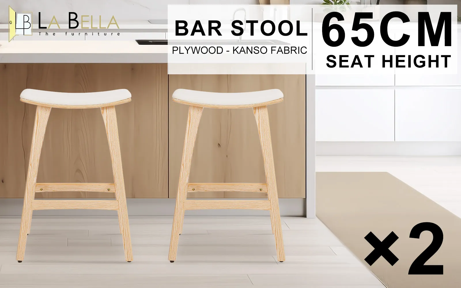 La Bella 2 Set Wooden Bar Stool 65cm KANSO Kitchen Barstools Padded Fabric Dining Chair - Beige