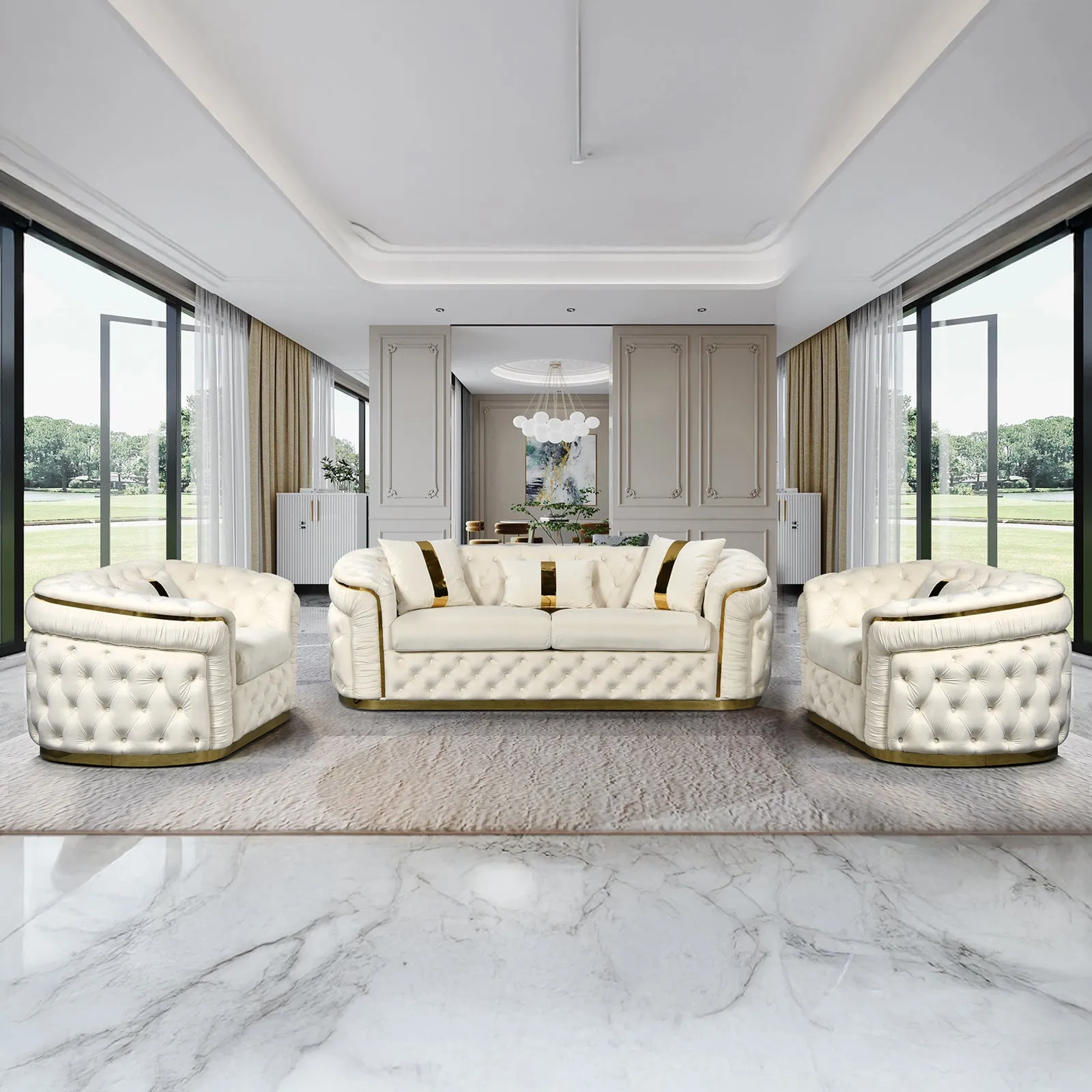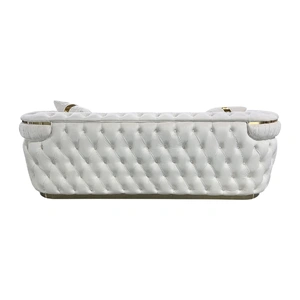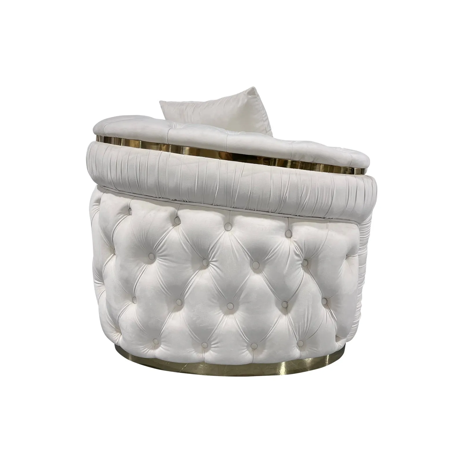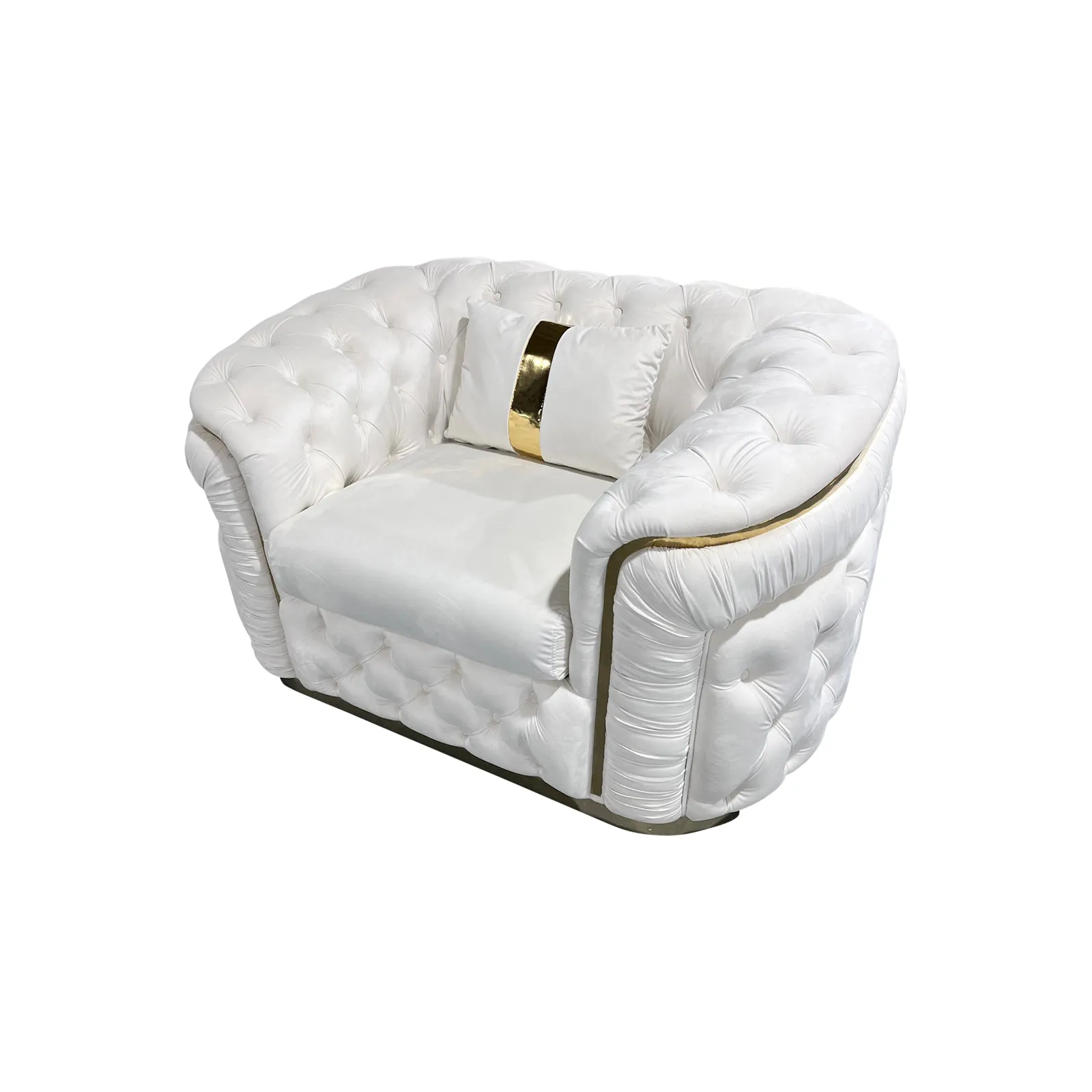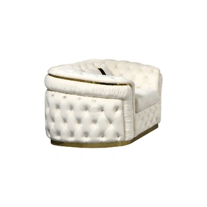 Duke sofa is finely decorated with deep quilting and upholstered buttons on high padded surface. Its design, half moon shape and golden base make it a very exclusive piece of furniture in your Living room.
