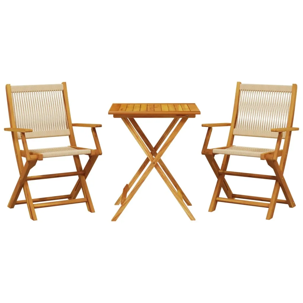 Enjoy a cup of coffee or have a chat with your family and friends in the garden, backyard, or on the balcony with this bistro set! Robust and stable: Solid acacia wood is known for its strength and durability. Its diverse colours and unique grain patterns give it an attractive appearance. With good stability and resistance to weathering, it is ideal for crafting indoor and outdoor furniture.Practical design: The practical and flat wooden handrail allows you to rest your hands on it while enjoying your outdoor time.Sturdy tabletop: The outdoor table offers excellent support for holding your drinks, snacks, fruit baskets, and your favourite decorations.Foldable design: The outdoor dining table and chairs can be easily folded away when not in use, for easy storage and transportation. Good to know:To make sure your outdoor furniture stays beautiful, we recommend protecting it with a waterproof cover.