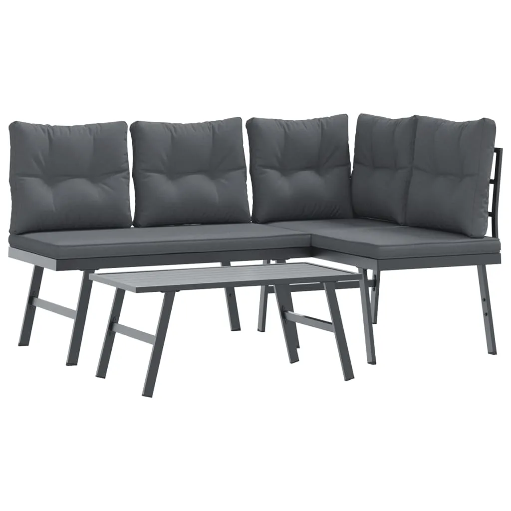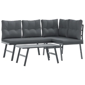 This garden bench set is perfect for outdoor use and is designed to be the focal point of your garden, terrace, patio, etc. Robust and stable frame: The powder-coated steel frame is strong, stable, durable, and resistant to corrosion and harsh weather, ensuring long-lasting performance.Comfy design: The slightly curved backrests add extra seating comfort for the bench.Comfortable seat experience: This outdoor furniture, complete with a thickly padded cushion, offers a comfortable seating experience.Sturdy tabletop: The sturdy tabletop of the sofa table is perfect for placing your drinks, food, and other decorative items.Modern design: The coffee table not only adds charm to your living space but also effortlessly complements a wide range of furniture styles. Good to know:To make sure your outdoor furniture stays beautiful, we recommend protecting it with a waterproof cover.