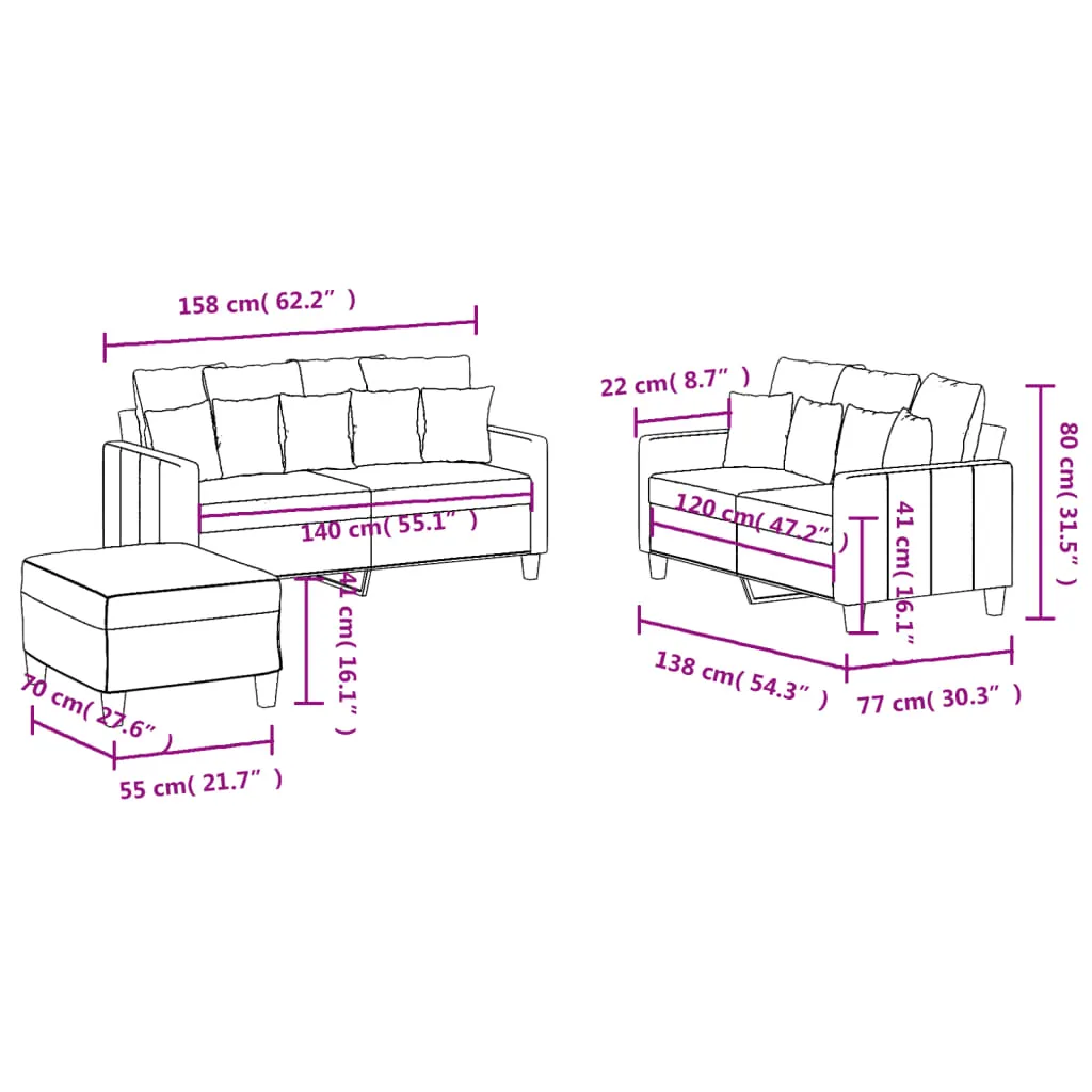 This sofa set is an excellent place for chatting, reading, watching TV, or just relaxing. It is meant to be a focal point in your home. Durable fabric: The fabric features a simple and clean look while remaining breathable and long-lasting.Sturdy and stable frame: The plywood and metal frame of the sofa seating ensures sturdiness and stability. Comfortable seat experience: The sofa is highly comfortable with the thickly padded seat, armrests, and back pillow. Versatile footstool: The footstool is suitable for resting your feet when you lie on a sofa or offering you an additional seat in your room. Additionally, the simple design and compact size make it ideal for almost all your living spaces.