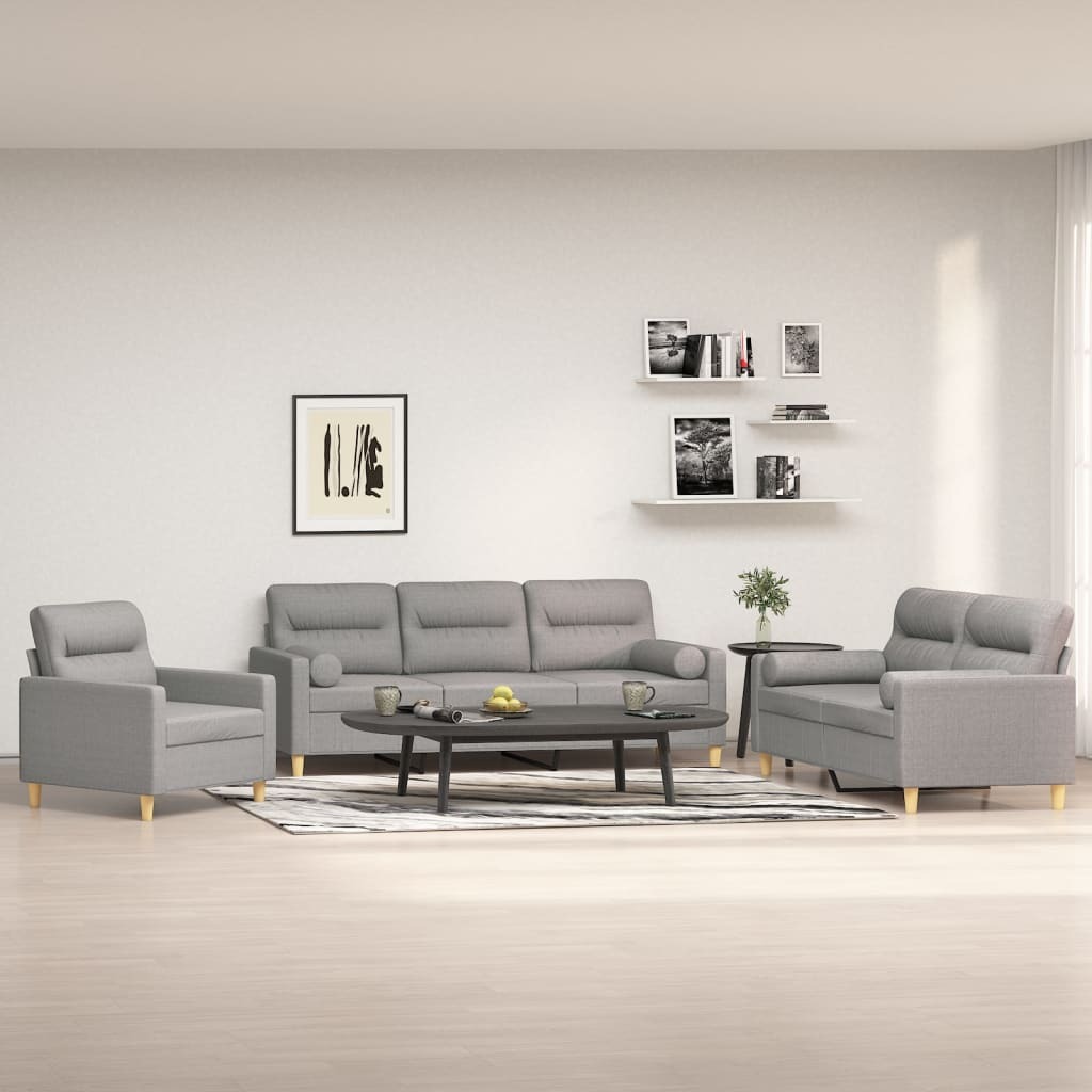 This sofa set is an excellent place for chatting, reading, watching TV or just relaxing. It is meant to be a focal point in your home. Durable fabric: The fabric features a simple and clean look, and is breathable and durable.Sturdy and stable frame: The plywood and metal frame of the fabric sofa ensures sturdiness and stability.Comfortable seat experience: The sofa is highly comfortable with the thickly padded seat, armrests and back pillow.Practical roll pillows: These cylinder pillows not only spruce up your decor, but can also add extra comfort when you are seated or lying.Eye-catching design: Featuring a simple yet modern design, this sofa seating is meant to be an eye-catcher in your room. Note:Each product comes with an assembly manual in the box for easy assembly.