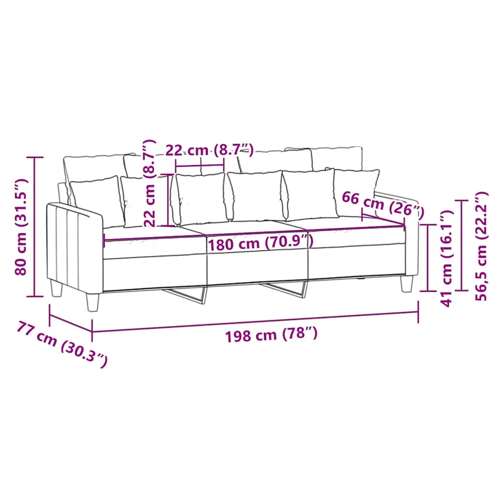 This 3-seater sofa is an excellent place for chatting, reading, watching TV or just relaxing. It is meant to be a focal point in your home. Durable fabric: The fabric features a simple and clean look while remaining breathable and long-lasting.Sturdy and stable frame: The metal frame of the upholstered sofa ensures sturdiness and stability.Comfortable seat experience: The sofa is highly comfortable with the thickly padded seats, armrests and back pillows.Eye-catching design: Featuring a simple yet modern design, this couch is meant to be an eye-catcher in your room.