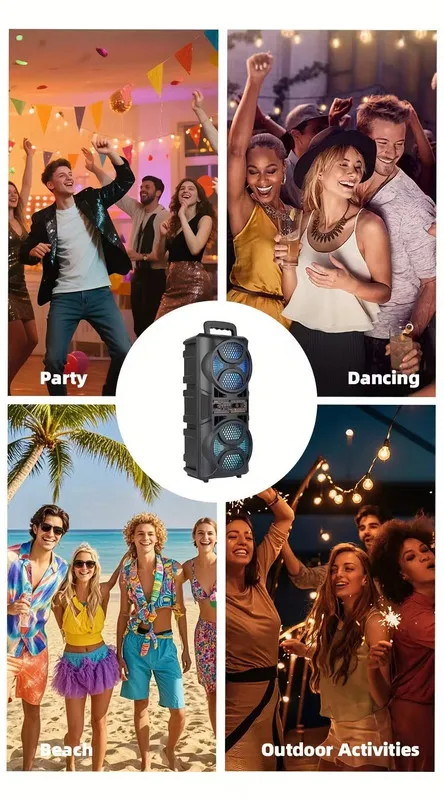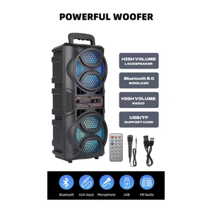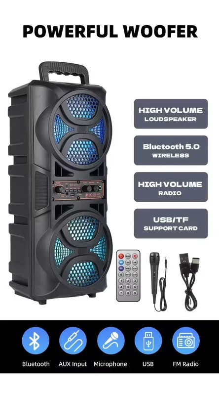 The 3000W Portable Wireless Speaker delivers immersive audio with dual 16.5cm subwoofers designed for rich, powerful bass. It supports multiple playback options including AUX, USB, SD card, and FM radio, giving you flexibility wherever you go. The built-in rechargeable lithium battery keeps the music playing for hours, and the colorful LED woofers add visual energy to your experience. Perfect for parties, gatherings, or home use, this speaker ensures clear, dynamic sound in any setting.