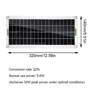 This solar panel achieves its peak power of 30W under optimal conditions, specifically when placed directly under sunlight at a 24-degree angle, with a light intensity of 600,000 lux.