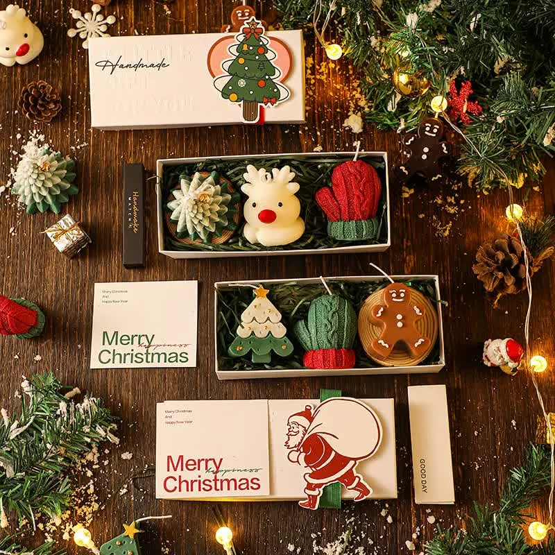 Christmas-Themed Designs: Candles feature holiday motifs like reindeer, Christmas trees, gingerbread men, and mittens (3 random designs). A variety of fragrances keep the seasonal ambiance fresh and joyful throughout the season.