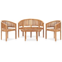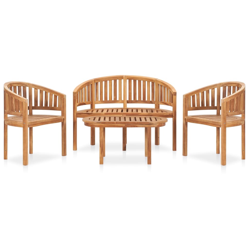 Create a relaxing lounge area with this trendy wooden banana garden lounge set. This piece of teak furniture, constructed from extremely durable teak hardwood, is seasoned, kiln-dried and fine sanded to give a very smooth appearance. Teak wood is known for its exceptional strength and weather resistance, making it far more suitable for garden furniture than any other kind of wood. Teak wood is the perfect choice if you want to purchase a long-lasting piece of garden furniture. The outdoor table has a sturdy top in a slatted design. Additionally, the banana-shaped design of chairs and bench give added beauty to this lounge set.