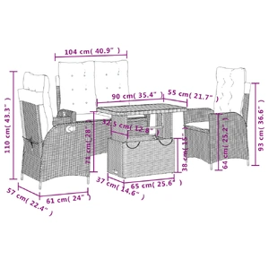 This garden dining set is a great choice for al fresco dining or just relaxing in the garden, backyard, or on the patio. Durable material: PE rattan, also known as poly rattan, is a strong, low-maintenance synthetic material that looks like natural rattan. It's lightweight, easy to clean, and commonly used for outdoor furniture due to its durability and weather-resistant properties.Adjustable backrest: This garden seat has a handle. You can adjust the backrest to any position by pulling the handle, and quickly return it to its original position.Adjustable tabletop: The tabletop can be lifted to make the table higher, which transforms the outdoor table from a coffee table to a dining table. It's perfect for having guests over or eating meals outside.Removable and washable cover: These seat cushions feature removable covers for easy washing and maintenance. The back cushions have a flap at the back for easy attachment to the backrests.Comfortable seat experience: This outdoor furniture, complete with thickly padded cushions, offers a comfortable seating experience. Good to know:To make sure your outdoor furniture stays beautiful, we recommend protecting it with a waterproof cover.