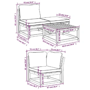 This wooden garden lounge set with cushions has an elegant design and is a great choice for relaxing and enjoying in the garden or patio. Solid acacia wood: Solid acacia wood is a beautiful natural material. Acacia wood is a tropical hardwood, which is dense, sturdy, and durable.Comfortable seat experience: The backrest and the thickly-padded cushions make the garden sofa set more comfortable to sit on.Slatted design: The slatted design of the wooden lounge set effectively prevents water from pooling, ensuring that the seat remains dry and free from potential rot.Modular design: This outdoor furniture set has a modular design, making it completely flexible and easy to move around, so you can create a customised outdoor furniture arrangement. Good to know:To make sure your outdoor furniture stays beautiful, we recommend protecting it with a waterproof cover.