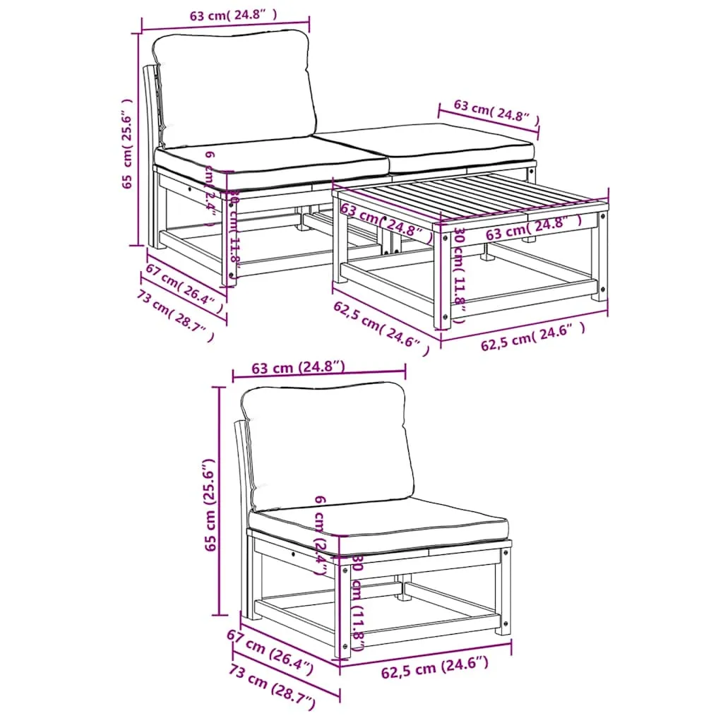 This wooden garden lounge set with cushions has an elegant design and is a great choice for relaxing and enjoying in the garden or patio. Solid acacia wood: Solid acacia wood is a beautiful natural material. Acacia wood is a tropical hardwood, which is dense, sturdy, and durable.Comfortable seat experience: The backrest and the thickly-padded cushions make the garden sofa set more comfortable to sit on.Slatted design: The slatted design of the wooden lounge set effectively prevents water from pooling, ensuring that the seat remains dry and free from potential rot.Modular design: This outdoor furniture set has a modular design, making it completely flexible and easy to move around, so you can create a customised outdoor furniture arrangement. Good to know:To make sure your outdoor furniture stays beautiful, we recommend protecting it with a waterproof cover.
