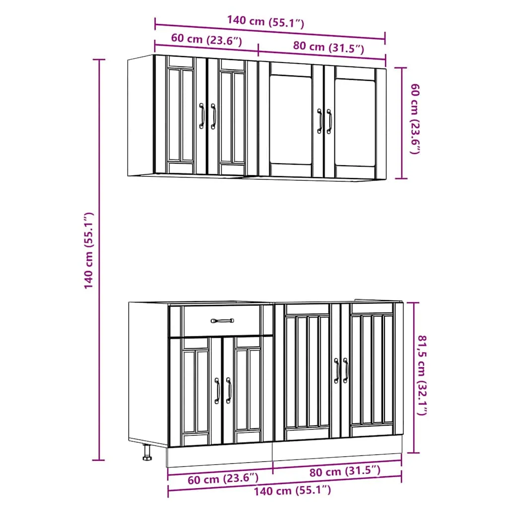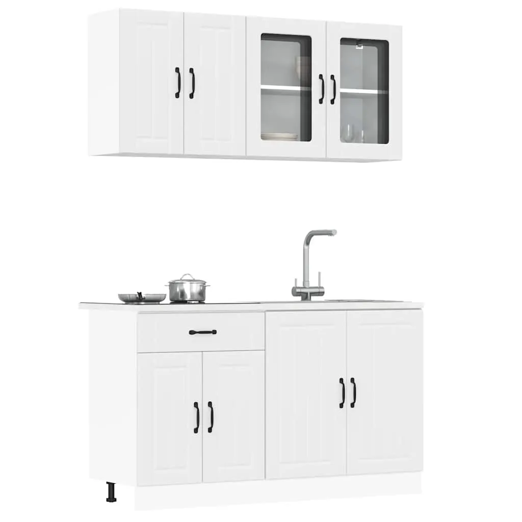 This 4-piece kitchen cabinet set, with its elegant design, optimises your kitchen space and provides ample storage space for your personal belongings! Stable and durable material: Engineered wood is a durable and stable material with a smooth surface that is resistant to moisture, warping, and splitting, making it a reliable choice for a variety of projects.Ample storage space: The kitchen cabinet set has many compartments, and offers sufficient space to store bowls, plates, pots, and other kitchen appliances.Adjustable feet: The bottom cabinets feature adjustable feet that can be adjusted in height to suit your kitchen layout.Easy to maintain: Thanks to its smooth surface, these kitchen cabinets are easy to clean with a damp cloth and require less maintenance. Warning:To prevent it from tipping over, this product must be used with the provided wall attachment device. Good to know:Screw(s) and plug(s) for inside the wall are not included. Seek and use screw(s) and plug(s) suitable for your walls. If you are uncertain, seek professional advice. Read and follow each step of the instruction carefully.The worktop, sink and faucet are not included in the delivery.