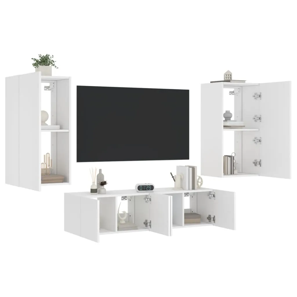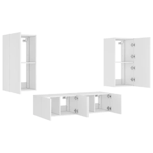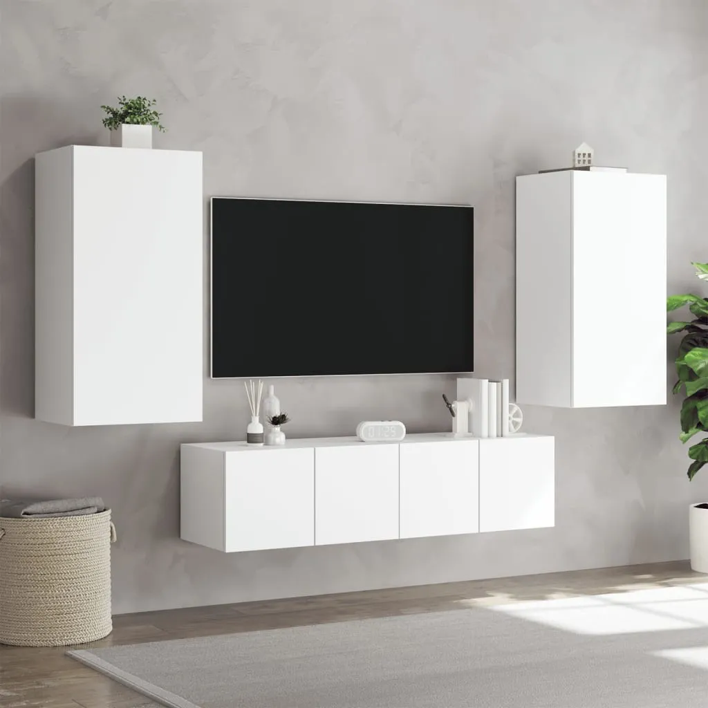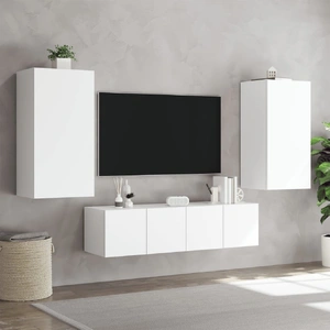 These TV wall units are the perfect solution for your living space to maximise space and keep the floor areas uncluttered. Sturdy material: The engineered wood is of exceptional quality with a smooth surface and also features strength, stability and resistance to moisture.RGB LED lights: The TV unit is equipped with vibrant RGB LED lights. With various customisable menus, you can effortlessly change the colour of the lights and even set them to adjust automatically. These LED lights not only enhance the contemporary look of the floating TV cabinet but also add to its trendy appeal.Wall-mounted design: The television unit can be wall-mounted to add extra storage space. That way, you can maximise your floor space and keep the area clean.Ample storage space: The floating TV unit provides ample space to store your daily essentials such as books, DVDs, magazines, media supplies and other items neatly organised and within easy reach.Versatile design: You can use it as a TV cabinet or mount it on the workplace wall for convenient storage of tools or other miscellaneous items. Also, it transforms an empty wall into a design feature. Good to know:Screws and plugs for inside the wall are not included. We advise to find and use screws and plugs suitable specifically for your walls. If you're not sure, you can consult with a professional. Please read and follow each step of the instructions.The product has a USB connector that requires a certified 5V USB power source (not included).