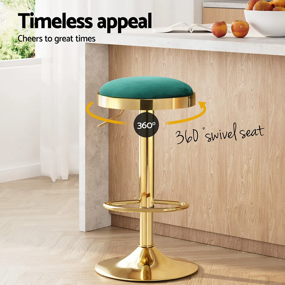 Enhance your dining or kitchen space with the Artiss Bar Stools, designed for both comfort and style. Upholstered in lush green velvet with a striking gold frame, these stools bring a sophisticated touch to any setting. The foam-padded seat provides a comfortable sitting experience, while the swivel function allows easy movement. Built with a sturdy steel base, a durable footrest, and a smooth gas lift lever, these stools offer both practicality and style. The chrome finish adds a refined touch, and the bottom rubber base helps protect your floors from scratches.