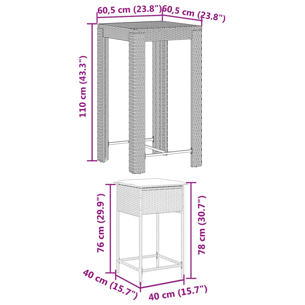 This trendy garden bar set, combining both style and function, is surely meant to be the centrepiece of your garden, patio, and any other living space. Durable material: PE rattan, also known as poly rattan, is a strong, low-maintenance synthetic material that looks like natural rattan. It's lightweight, easy to clean, and commonly used for outdoor furniture due to its durability and weather-resistant properties.Comfortable seat experience: This outdoor furniture, complete with thickly padded cushions, offers a comfortable seating experience.Removable and washable cover: These seat cushions feature removable covers for easy washing and maintenance.Robust and stable frame: The powder-coated steel frame ensures that the garden furniture is strong and stable for daily outdoor use. Good to know:To make sure your outdoor furniture stays beautiful, we recommend protecting it with a waterproof cover.