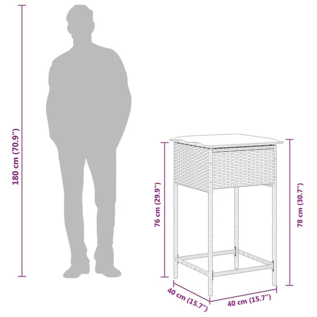 This trendy garden bar set, combining both style and function, is surely meant to be the centrepiece of your garden, patio, and any other living space. Durable material: PE rattan, also known as poly rattan, is a strong, low-maintenance synthetic material that looks like natural rattan. It's lightweight, easy to clean, and commonly used for outdoor furniture due to its durability and weather-resistant properties.Comfortable seat experience: This outdoor furniture, complete with thickly padded cushions, offers a comfortable seating experience.Removable and washable cover: These seat cushions feature removable covers for easy washing and maintenance.Stable and easy-to-clean tabletop: This garden table has an acacia wood top that is sturdy, durable, and easy to clean with a damp cloth.Robust and stable frame: The powder-coated steel frame ensures that the garden furniture is strong and stable for daily outdoor use. Good to know:To make sure your outdoor furniture stays beautiful, we recommend protecting it with a waterproof cover.