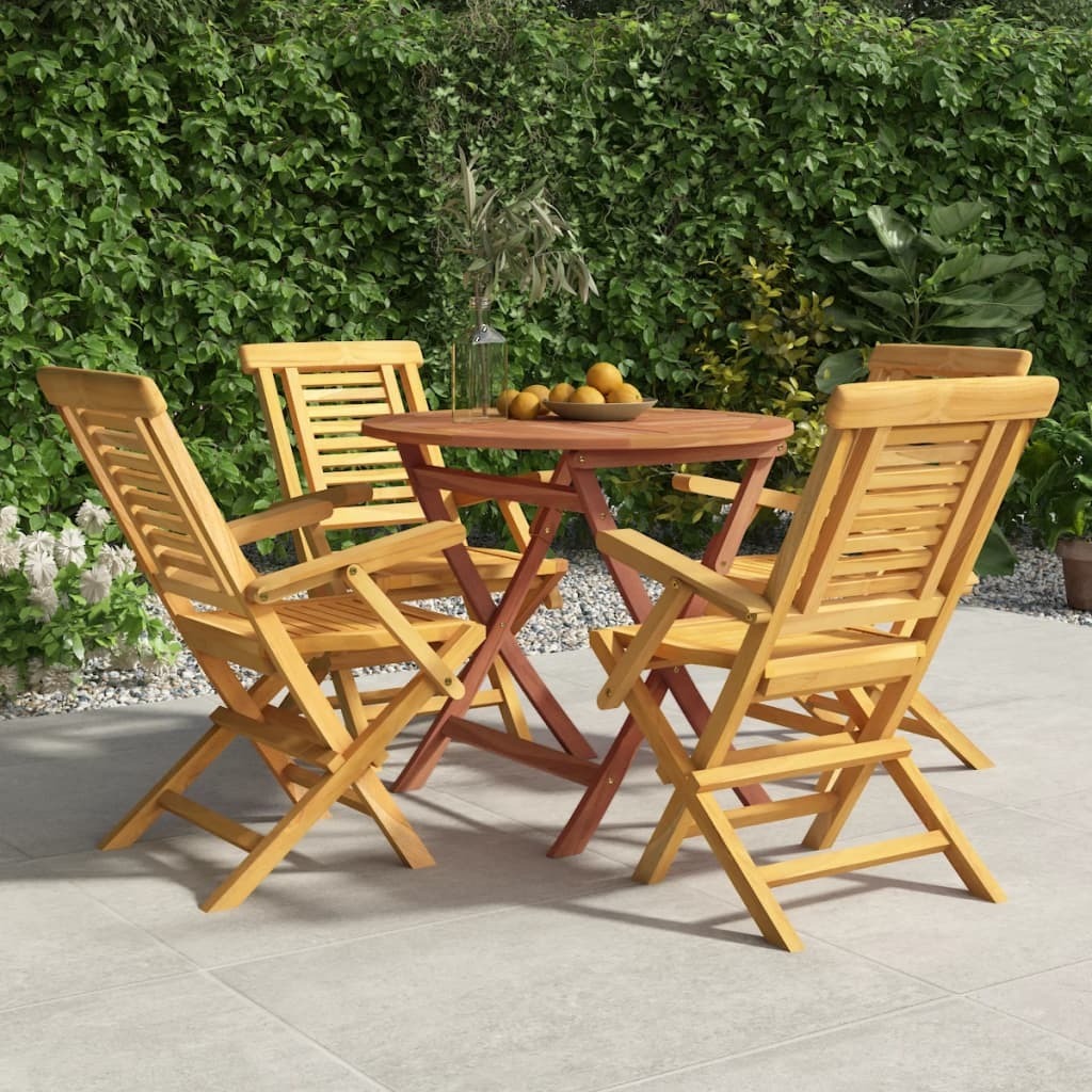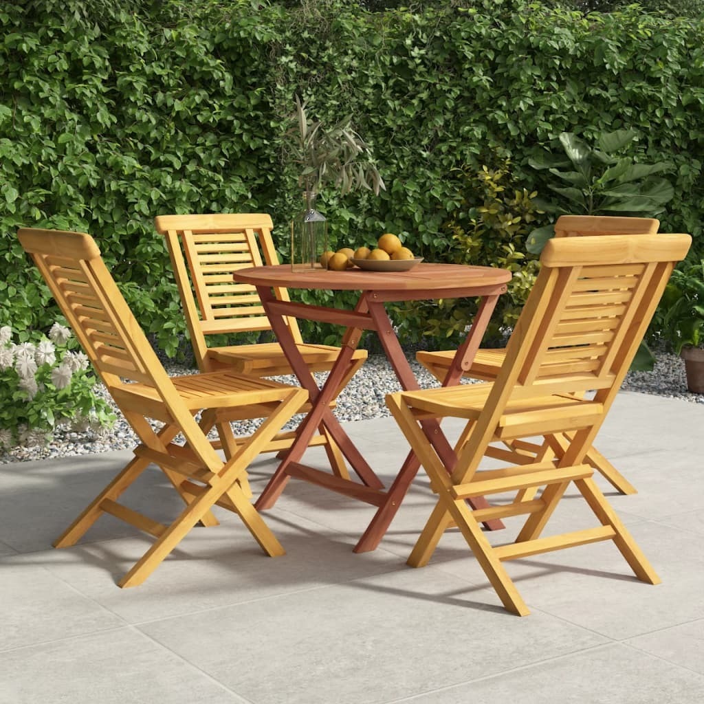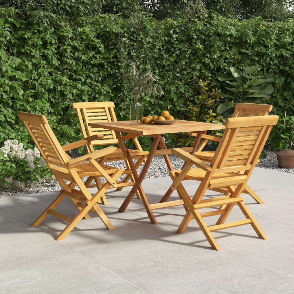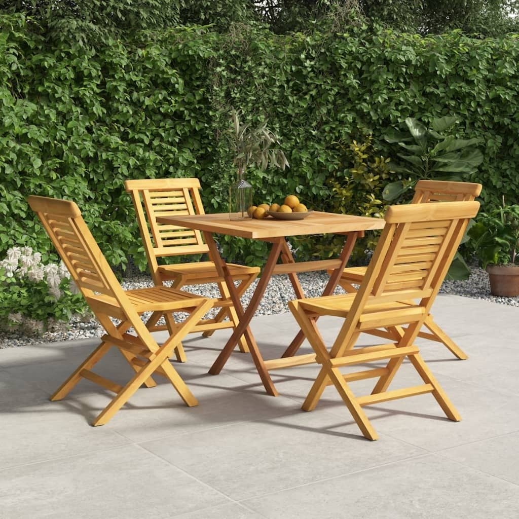 Relax and enjoy a lovely afternoon tea and meals with your family and friends with this classic wooden garden dining set! Solid teak wood: The dining set is made of solid teak wood. Solid teak wood is a beautiful natural material. It has been seasoned, kiln dried and then fine sanded to give a very smooth appearance. Teak wood is known for its exceptional strength and weather resistance.Foldable function: The outdoor dining set can be folded to save space when not in use.Comfortable experience: The backrest of the garden dining chair gives you excellent support, providing an optimal comfortable experience.Sturdy tabletop: The sturdy tabletop of the dining table is perfect for placing meals, drinks, vases, fruit bowls, or other decorative items.Parasol hole: There is a parasol hole in the tabletop so you can easily attach a parasol to create a shady spot.Slatted design: The outdoor dining chair designed with a slatted design looks simple and timeless. Note:To make sure your outdoor furniture stays beautiful, we recommend protecting it with a waterproof cover.