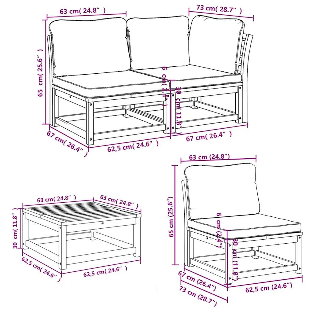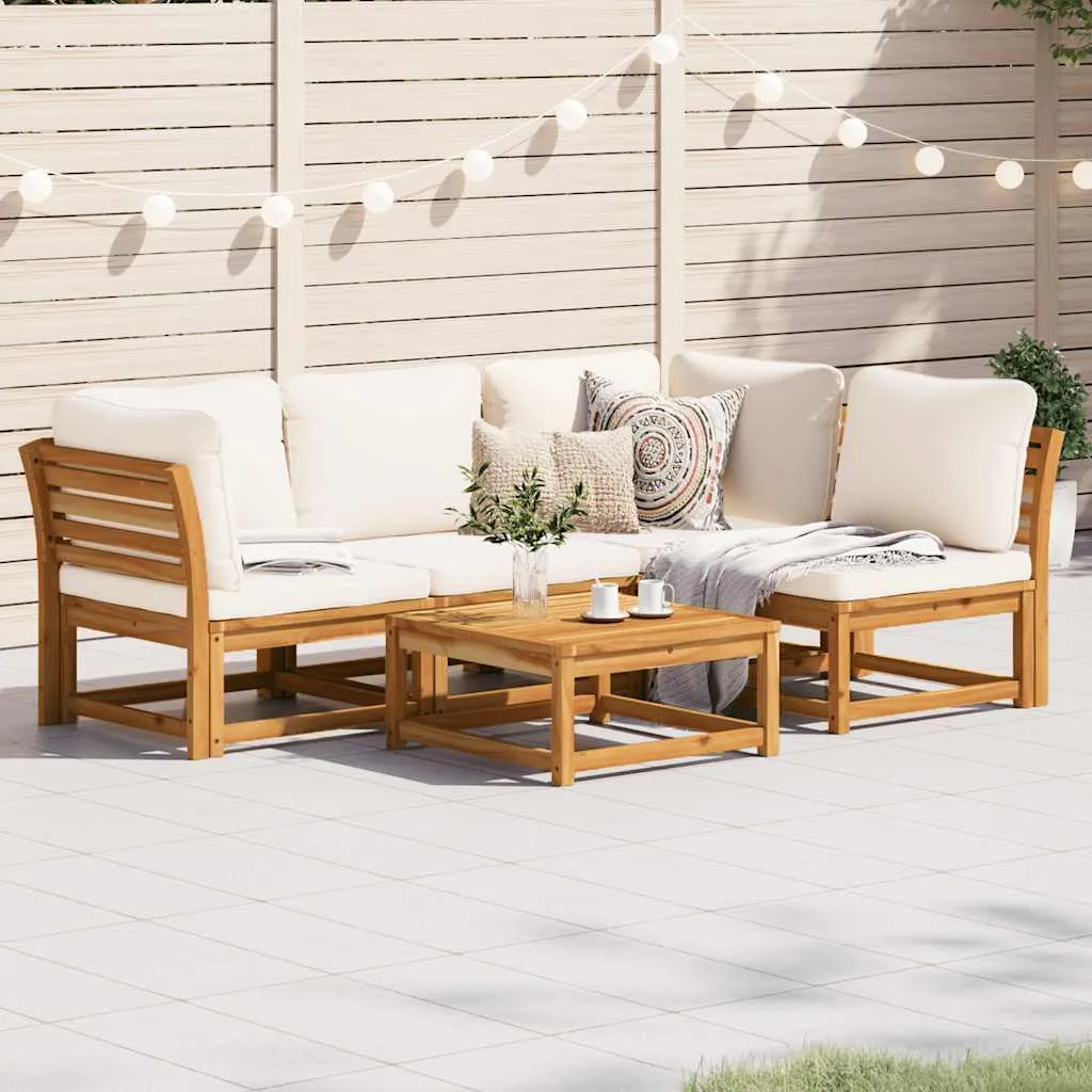 This wooden garden lounge set with cushions has an elegant design and is a great choice for relaxing and enjoying in the garden or patio. Solid acacia wood: Solid acacia wood is a beautiful natural material. Acacia wood is a tropical hardwood, which is dense, sturdy, and durable.Comfortable seat experience: The backrest and the thickly-padded cushions make the garden sofa set more comfortable to sit on.Slatted design: The slatted design of the wooden lounge set effectively prevents water from pooling, ensuring that the seat remains dry and free from potential rot.Modular design: This outdoor furniture set has a modular design, making it completely flexible and easy to move around, so you can create a customised outdoor furniture arrangement. Good to know:To make sure your outdoor furniture stays beautiful, we recommend protecting it with a waterproof cover.