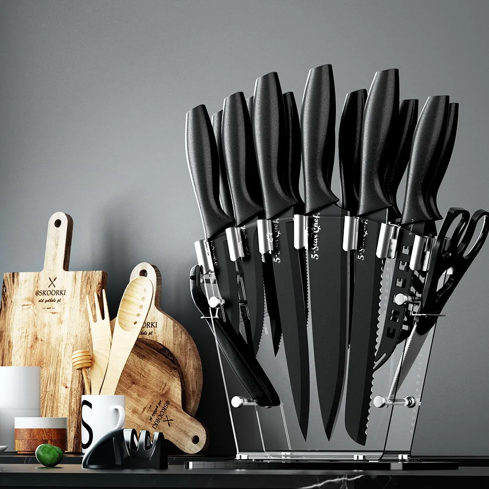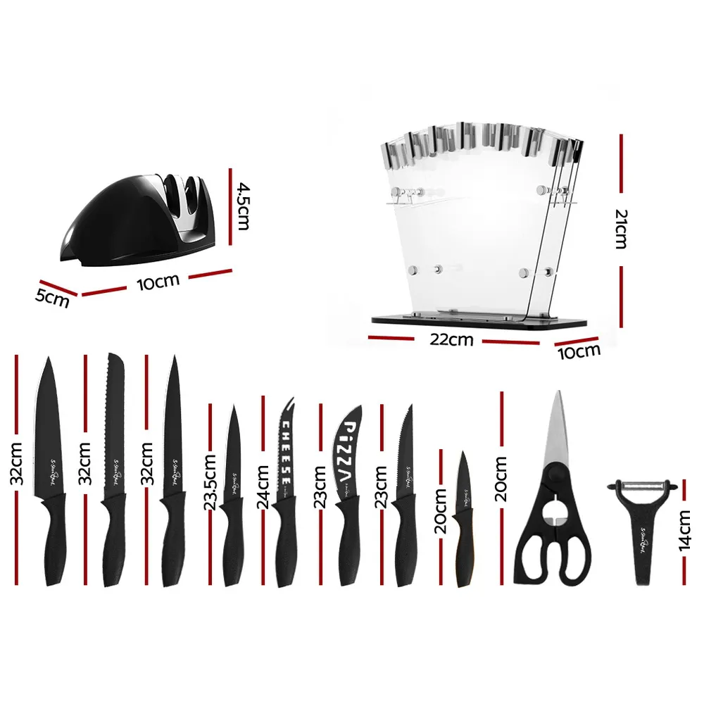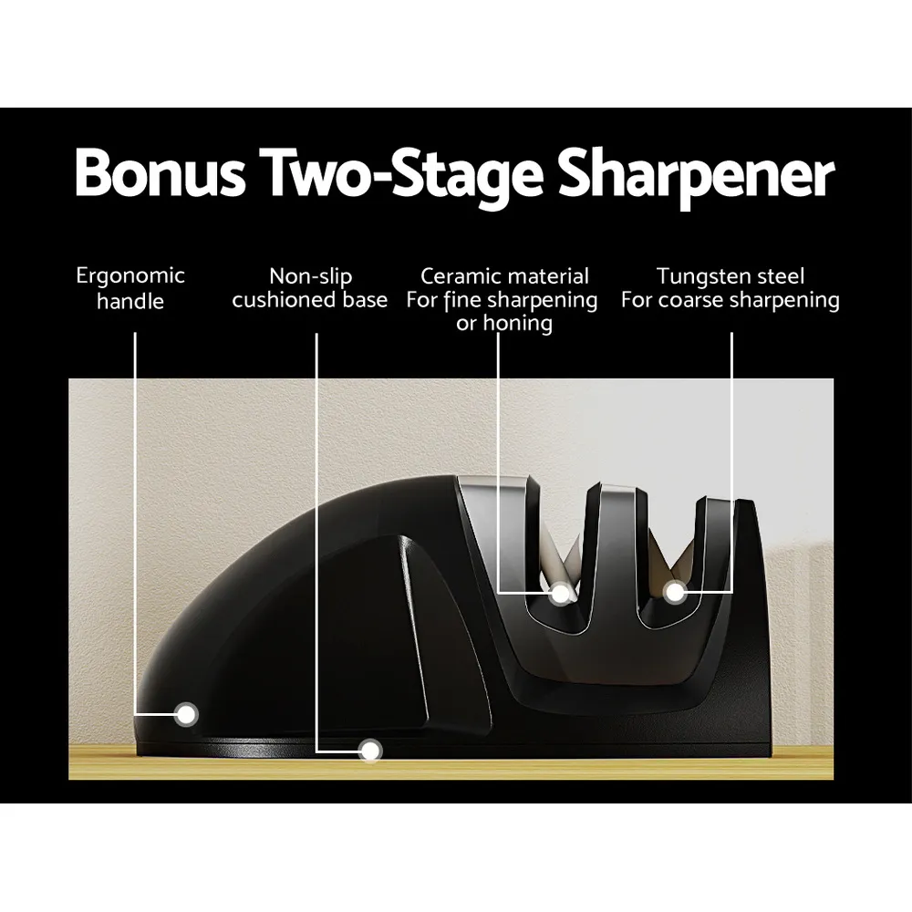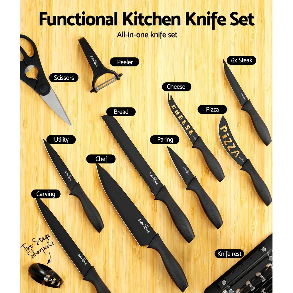 Do you love to cook? Our 17-Piece Kitchen Knife Set will keep your cooking skills sharp. The knife set comes with a chef knife, bread knife, carving knife, utility knife, paring knife, cheese knife, pizza knife, vegetable peeler, kitchen scissors, six steak knives and a wooden knife block to keep your collection organised and protected. Slice, dice, cut and gut, there's a knife for every cooking situation. Each knife is made from quality stainless steel and is constructed from a single piece for extra comfort and protection. Unlike other basic kitchen knife sets, our knives feature a non-scratch, non-stick coating that is easy to clean and incredibly rust-resistant. The knives have a well-balanced hollow ergonomic handle making them easy to hold and use. Includes a two-stage sharpener to keep your knives sharp and ready to go at all times. The knives have a hardness rating (HRC) of 53�2, making them perfect for student chefs and home cooks on a budget. With its sleek modern design, the knife set is the perfect gift for a budding chef, first homeowner, or even for yourself. Spruce up your kitchen and elevate your cooking skills today with our comprehensive 17-Piece Knife Set.