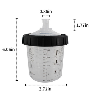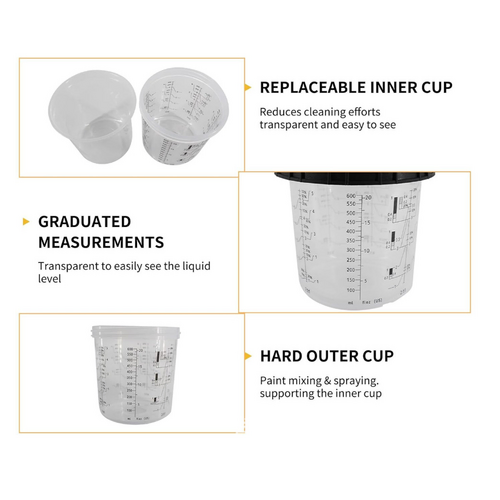 Disposable Paint Spray Gun Cup Liners and Lid System, 50 Pack Standard Size 20 ounce (600ml) Kit. Kit includes 50 cup liners with the fluid capacity, 50 lids with built-in 125-micron fluid strainers, 1 hard cup with retainer ring and 20 cup sealing plugs.