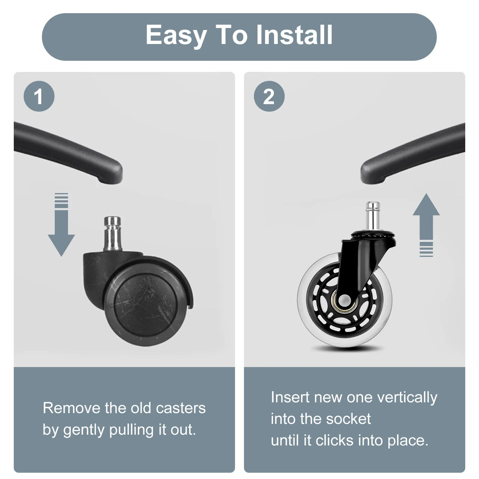 Installation is quick and easy. Simply insert the casters into the existing slot of your office chair or compatible furniture. Their rollerblade-style design ensures a versatile upgrade that fits office chairs, desks, tables, and cabinets.