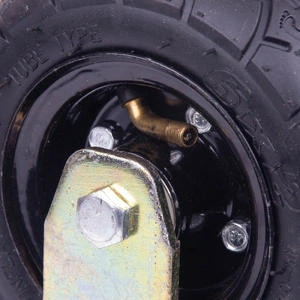 Easy for you to maneuver. 4 lugs per wheel. Rim separates into two pieces if you need to change the inner tube. Metal steel forks. haul any outdoor gear around the property.