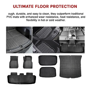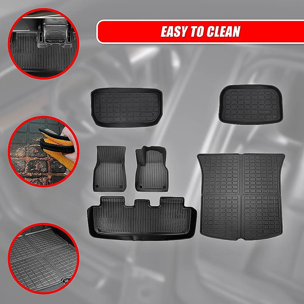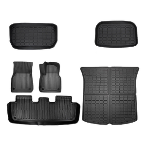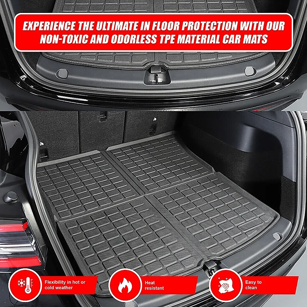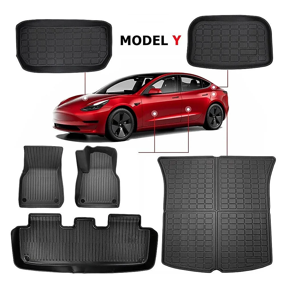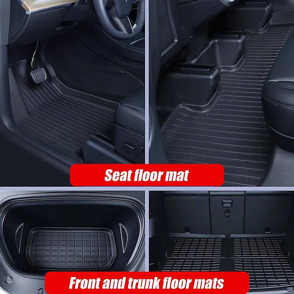 Enjoy all-weather protection with our customized design tailored specifically for the 7-seat model Y. This full set of mats includes floor mats, frunk mat, trunk mat, and trunk seat back mats, ensuring comprehensive coverage for your vehicle. Designed to fit the contours of the 2021-2022 Tesla Model Y interior and similar vehicles, these mats offer a perfect, snug fit for your car.