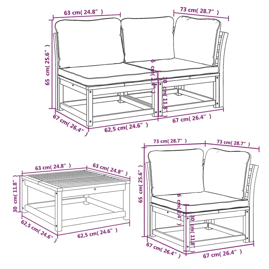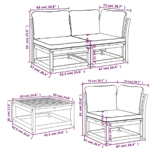 This wooden garden lounge set with cushions has an elegant design and is a great choice for relaxing and enjoying in the garden or patio. Solid acacia wood: Solid acacia wood is a beautiful natural material. Acacia wood is a tropical hardwood, which is dense, sturdy, and durable.Comfortable seat experience: The backrest and the thickly-padded cushions make the garden sofa set more comfortable to sit on.Slatted design: The slatted design of the wooden lounge set effectively prevents water from pooling, ensuring that the seat remains dry and free from potential rot.Modular design: This outdoor furniture set has a modular design, making it completely flexible and easy to move around, so you can create a customised outdoor furniture arrangement. Good to know:To make sure your outdoor furniture stays beautiful, we recommend protecting it with a waterproof cover.