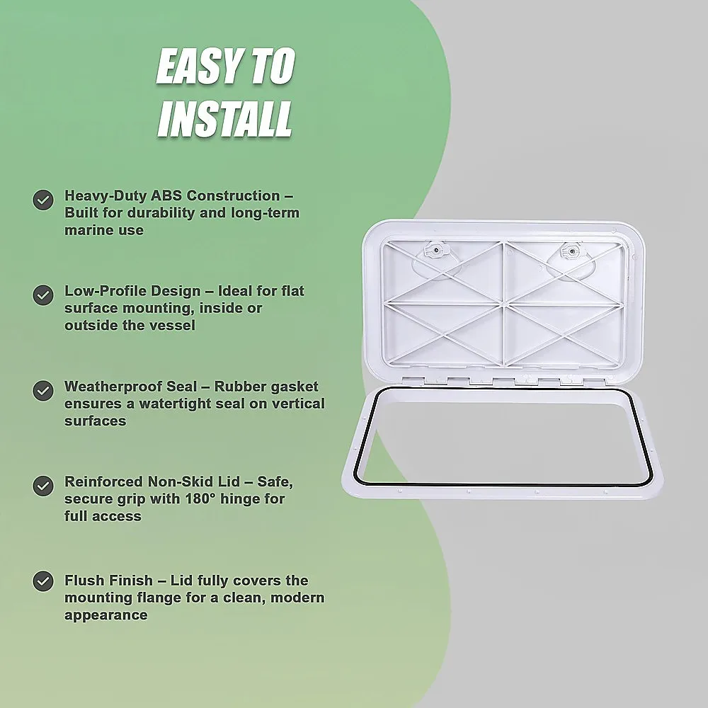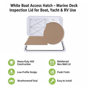 Upgrade your marine or RV storage with this White Marine Boat Deck Access Hatch*, engineered for strength, longevity, and seamless integration. Constructed from heavy-duty ABS plastic, this low-profile hatch is built to withstand harsh marine environments while providing a clean, flush-mounted finish. Suitable for both internal and external flat surfaces, the hatch features a reinforced, non-skid lid that opens 180 and completely conceals the mounting flangedelivering both function and a sleek look.