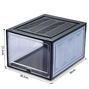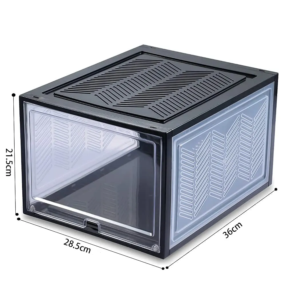 measures 21.5 cm (Height) 33 cm (Length) 28.5 cm (Width), these stackable storage boxes with clear lids provides plenty of space to keep shoes up to size 46 within easy reach.