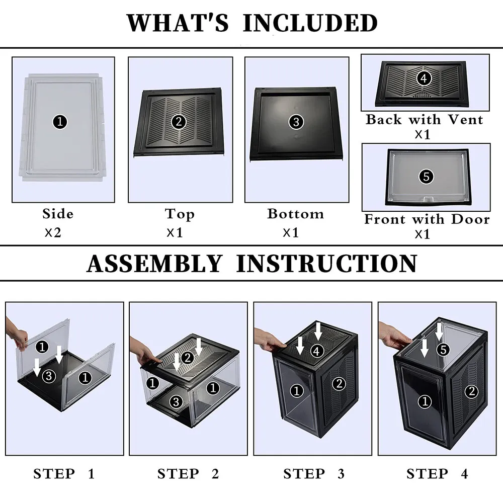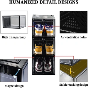 Made of sturdy plastic planes to withstand everyday use, a crystal clear door with strong magnets can be conveniently inset on the top or bottom of each shoe box,