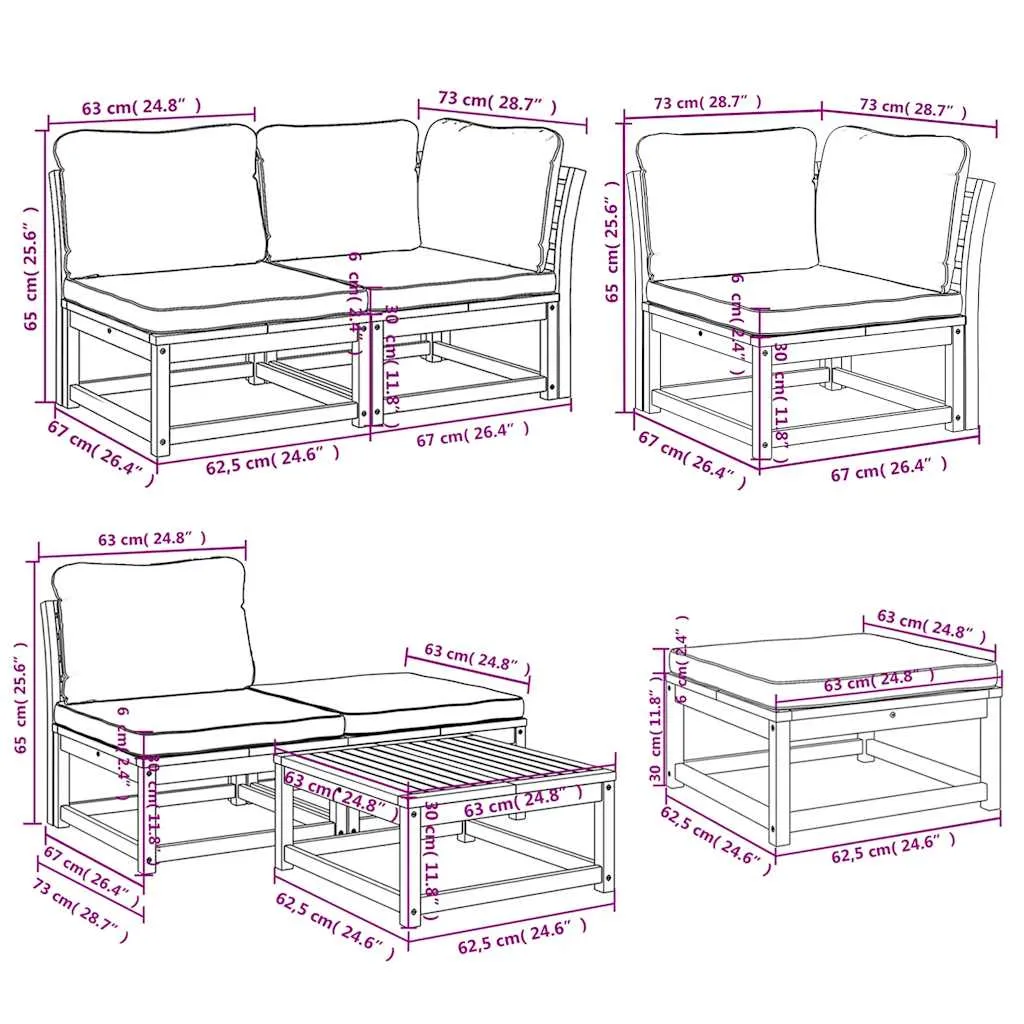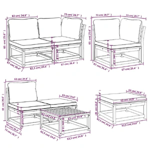This wooden garden lounge set with cushions has an elegant design and is a great choice for relaxing and enjoying in the garden or patio. Solid acacia wood: Solid acacia wood is a beautiful natural material. Acacia wood is a tropical hardwood, which is dense, sturdy, and durable.Comfortable seat experience: The backrest and the thickly-padded cushions make the garden sofa set more comfortable to sit on.Slatted design: The slatted design of the wooden lounge set effectively prevents water from pooling, ensuring that the seat remains dry and free from potential rot.Modular design: This outdoor furniture set has a modular design, making it completely flexible and easy to move around, so you can create a customised outdoor furniture arrangement. Good to know:To make sure your outdoor furniture stays beautiful, we recommend protecting it with a waterproof cover.