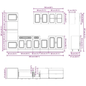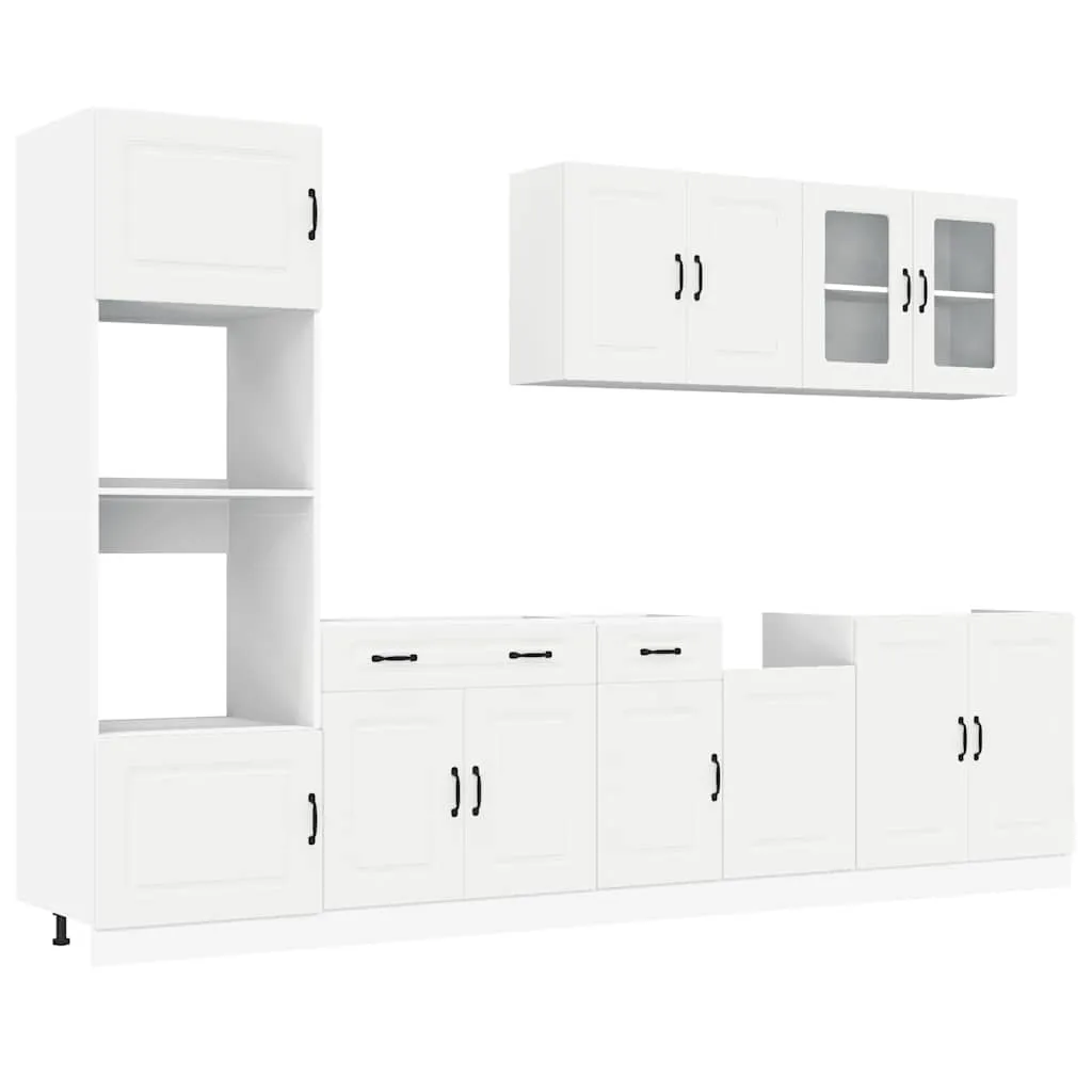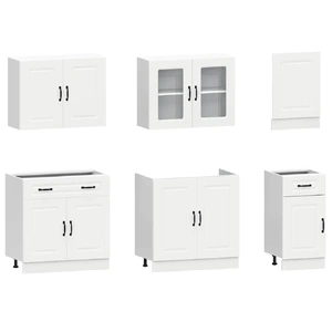 This 7-piece kitchen cabinet set, with its elegant design, optimises your kitchen space and provides ample storage space for your personal belongings! Stable and durable material: Engineered wood is a durable and stable material with a smooth surface that is resistant to moisture, warping, and splitting, making it a reliable choice for a variety of projects.Ample storage space: The kitchen cabinet set has many compartments, and offers sufficient space to store bowls, plates, pots, and other kitchen appliances.Adjustable feet: The bottom cabinets feature adjustable feet that can be adjusted in height to suit your kitchen layout.Easy to maintain: Thanks to its smooth surface, these kitchen cabinets are easy to clean with a damp cloth and require less maintenance. Warning:To prevent it from tipping over, this product must be used with the provided wall attachment device. Good to know:Screw(s) and plug(s) for inside the wall are not included. Seek and use screw(s) and plug(s) suitable for your walls. If you are uncertain, seek professional advice. Read and follow each step of the instruction carefully.The worktop, sink and faucet are not included in the delivery.
