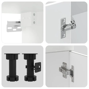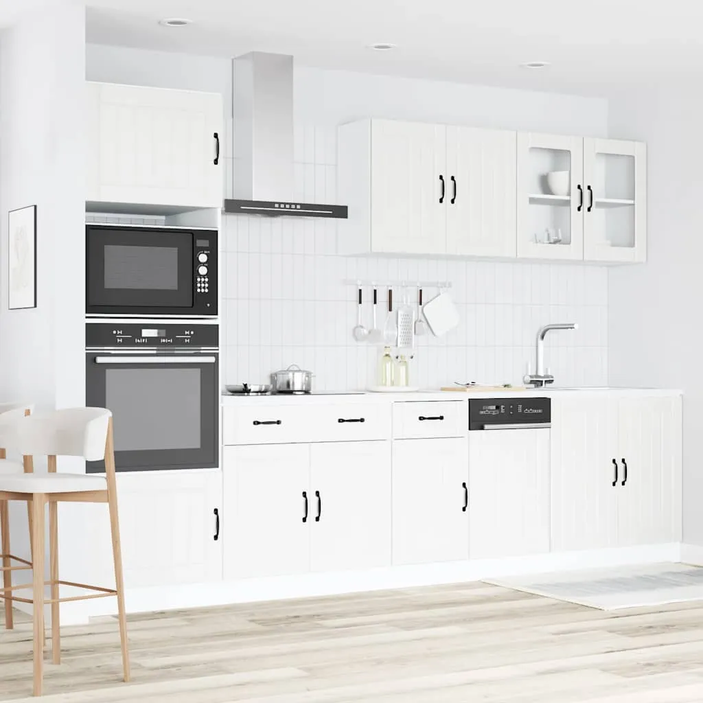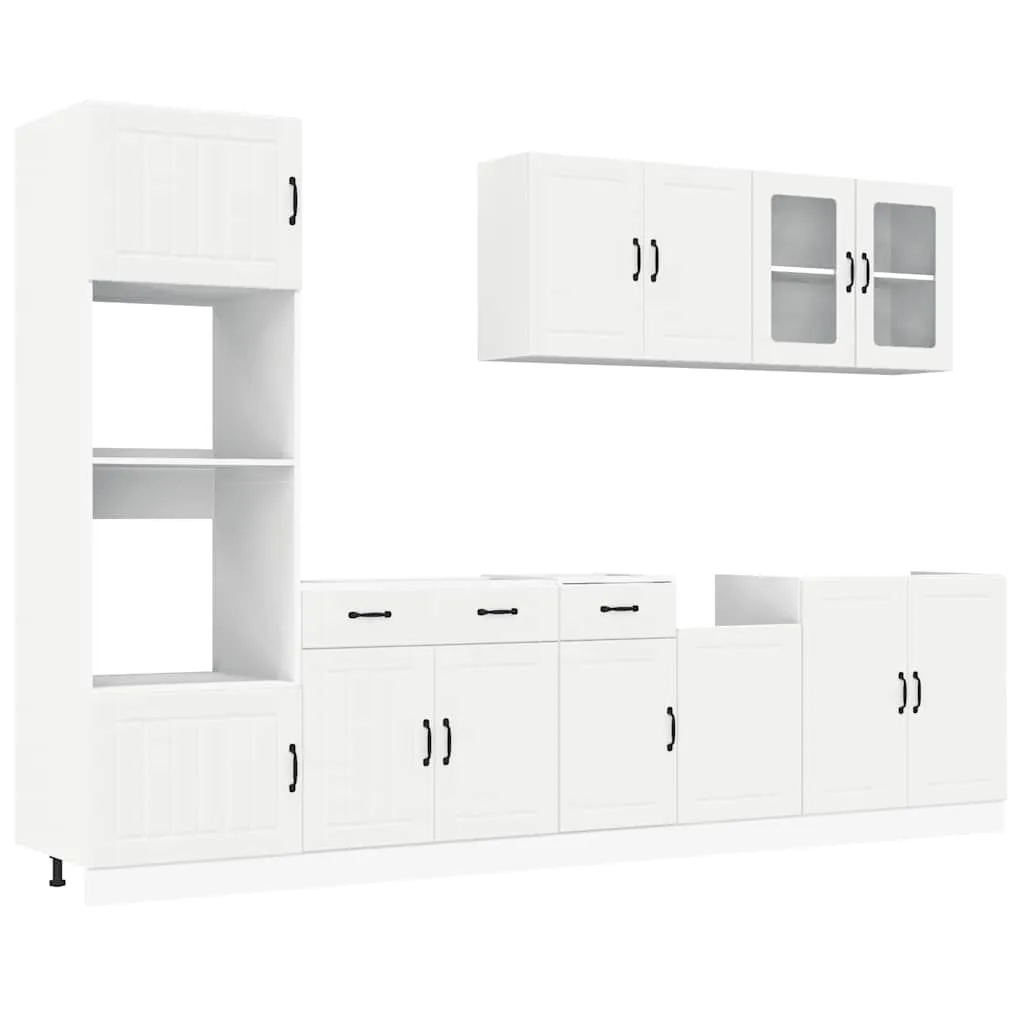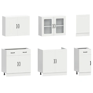 This 7-piece kitchen cabinet set, with its elegant design, optimises your kitchen space and provides ample storage space for your personal belongings! Stable and durable material: Engineered wood is a durable and stable material with a smooth surface that is resistant to moisture, warping, and splitting, making it a reliable choice for a variety of projects.Ample storage space: The kitchen cabinet set has many compartments, and offers sufficient space to store bowls, plates, pots, and other kitchen appliances.Adjustable feet: The bottom cabinets feature adjustable feet that can be adjusted in height to suit your kitchen layout.Easy to maintain: Thanks to its smooth surface, these kitchen cabinets are easy to clean with a damp cloth and require less maintenance. Warning:To prevent it from tipping over, this product must be used with the provided wall attachment device. Good to know:Screw(s) and plug(s) for inside the wall are not included. Seek and use screw(s) and plug(s) suitable for your walls. If you are uncertain, seek professional advice. Read and follow each step of the instruction carefully.The worktop, sink and faucet are not included in the delivery.