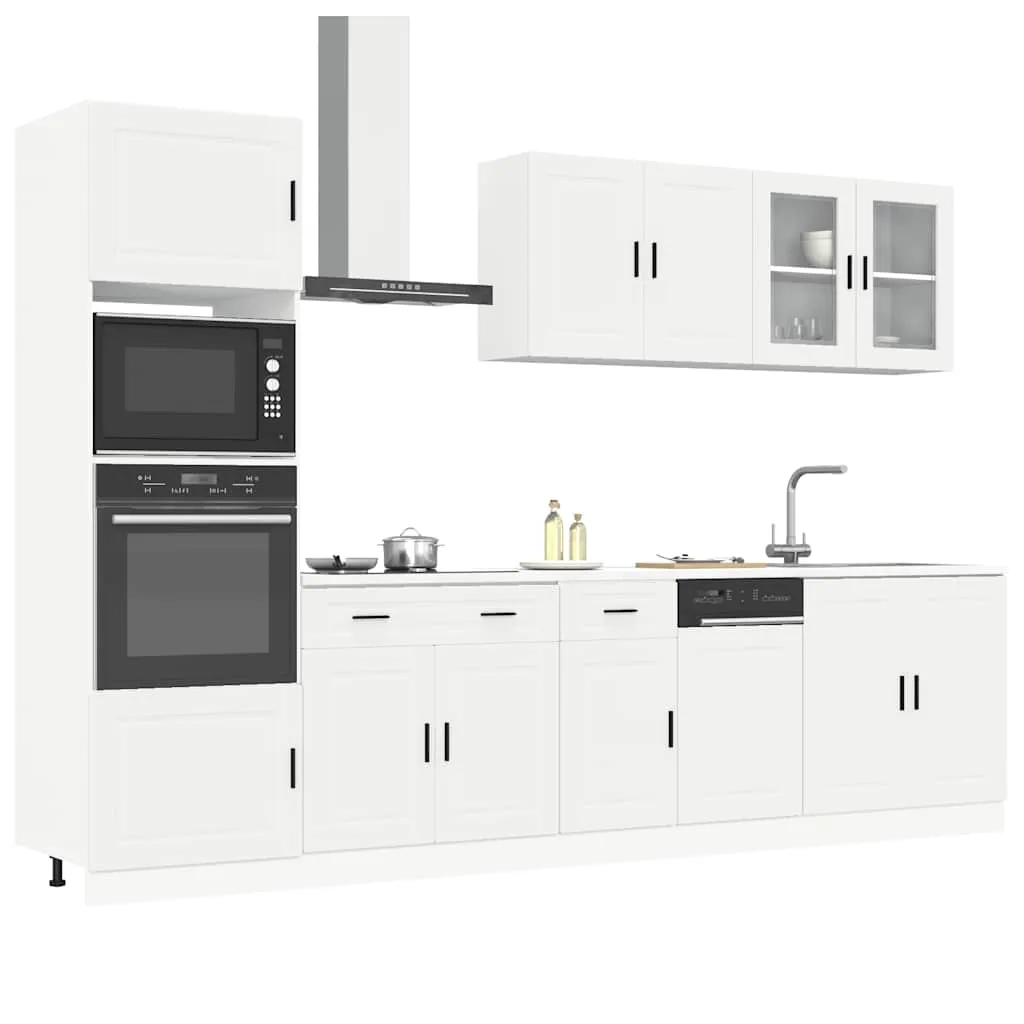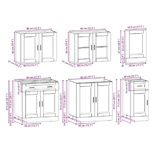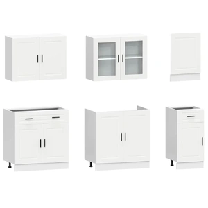 This 7-piece kitchen cabinet set, with its elegant design, optimises your kitchen space and provides ample storage space for your personal belongings! Stable and durable material: Engineered wood is a durable and stable material with a smooth surface that is resistant to moisture, warping, and splitting, making it a reliable choice for a variety of projects.Ample storage space: The kitchen cabinet set has many compartments, and offers sufficient space to store bowls, plates, pots, and other kitchen appliances.Adjustable feet: The bottom cabinets feature adjustable feet that can be adjusted in height to suit your kitchen layout.Easy to maintain: Thanks to its smooth surface, these kitchen cabinets are easy to clean with a damp cloth and require less maintenance. Warning:To prevent it from tipping over, this product must be used with the provided wall attachment device. Good to know:Screw(s) and plug(s) for inside the wall are not included. Seek and use screw(s) and plug(s) suitable for your walls. If you are uncertain, seek professional advice. Read and follow each step of the instruction carefully.The worktop, sink and faucet are not included in the delivery.