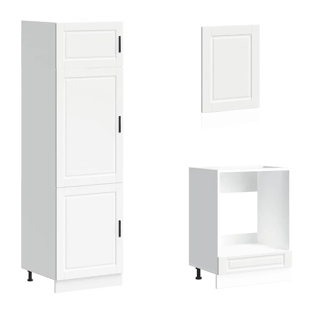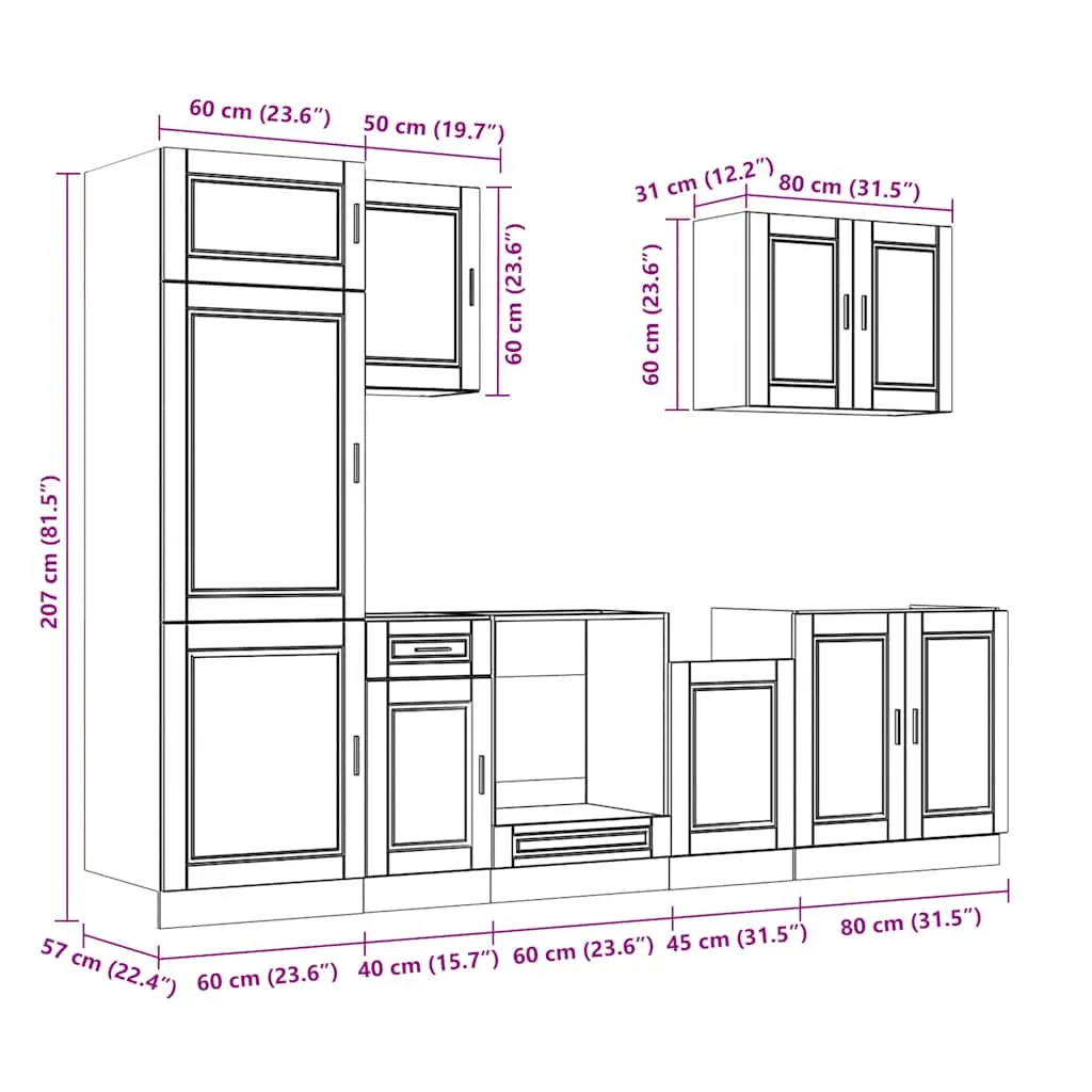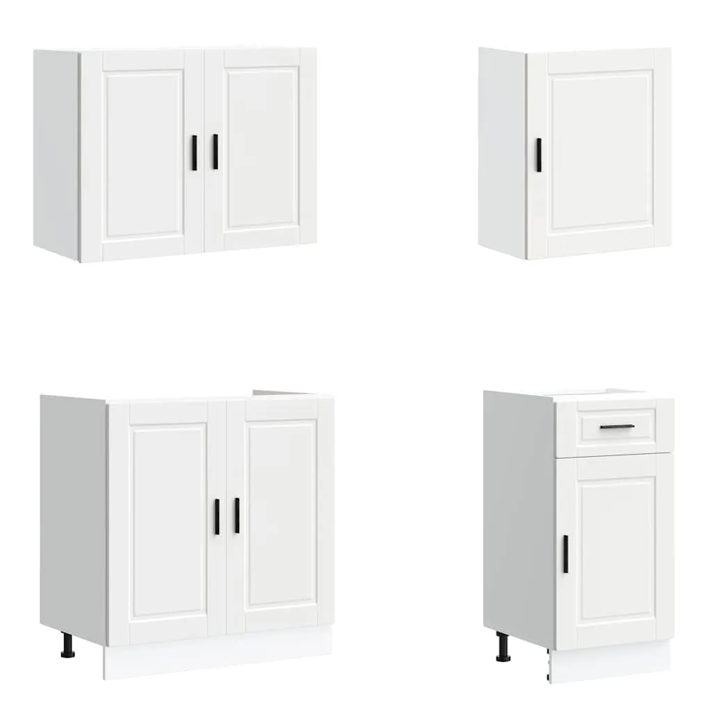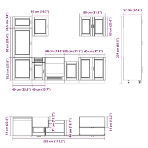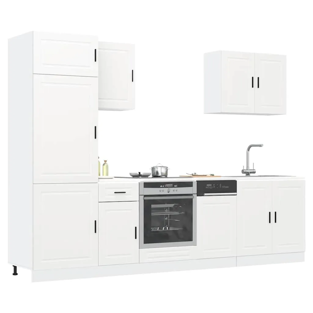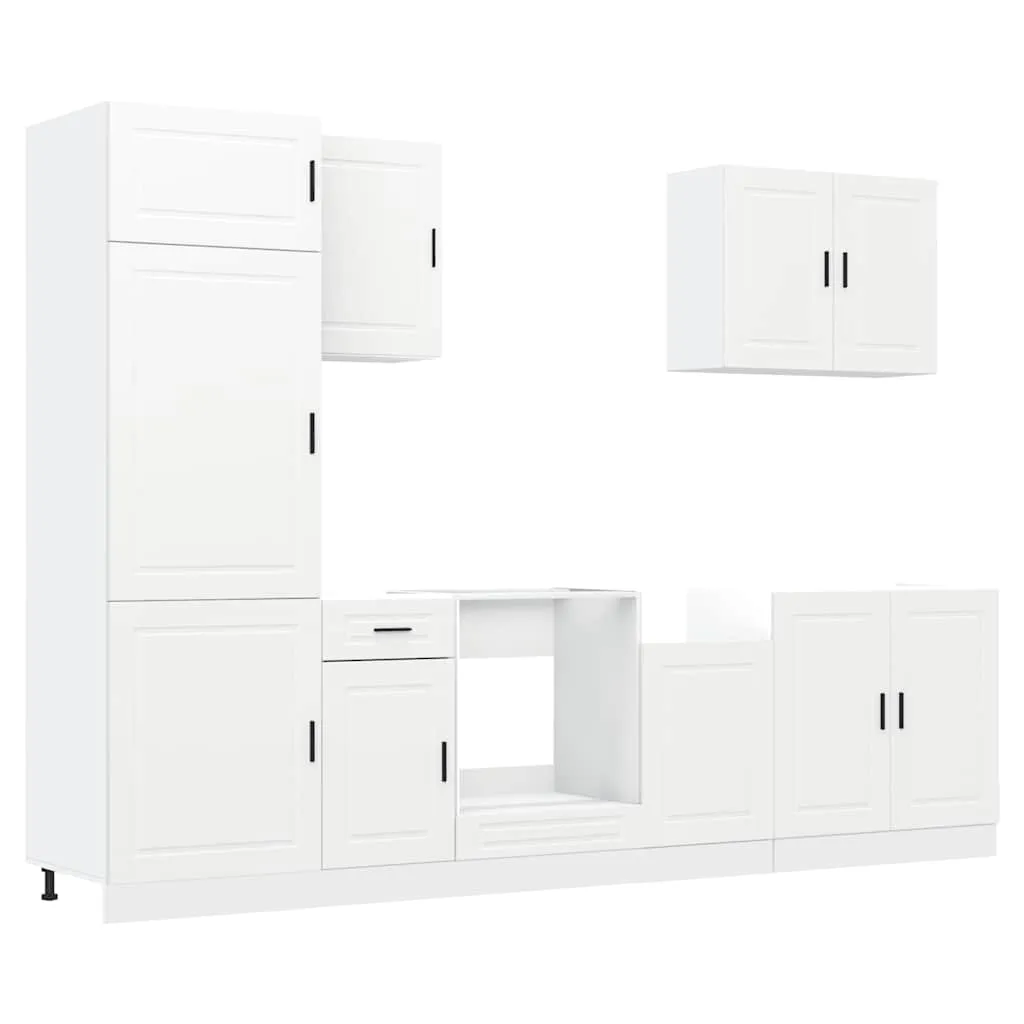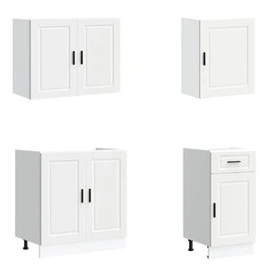 This 7-piece kitchen cabinet set, with its elegant design, optimises your kitchen space and provides ample storage space for your personal belongings! Stable and durable material: Engineered wood is a durable and stable material with a smooth surface that is resistant to moisture, warping, and splitting, making it a reliable choice for a variety of projects.Ample storage space: The kitchen cabinet set has many compartments, and offers sufficient space to store bowls, plates, pots, and other kitchen appliances.Adjustable feet: The bottom cabinets feature adjustable feet that can be adjusted in height to suit your kitchen layout.Easy to maintain: Thanks to its smooth surface, these kitchen cabinets are easy to clean with a damp cloth and require less maintenance. Warning:To prevent it from tipping over, this product must be used with the provided wall attachment device. Good to know:Screw(s) and plug(s) for inside the wall are not included. Seek and use screw(s) and plug(s) suitable for your walls. If you are uncertain, seek professional advice. Read and follow each step of the instruction carefully.The worktop, sink and faucet are not included in the delivery.