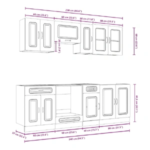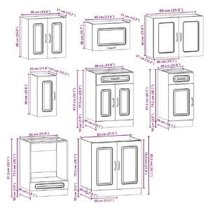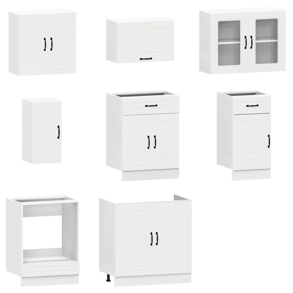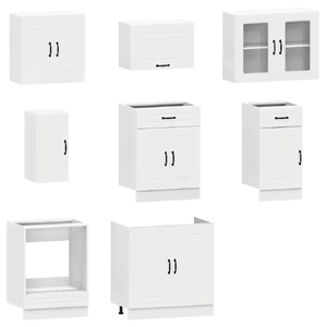 This 8-piece kitchen cabinet set, with its elegant design, optimises your kitchen space and provides ample storage space for your personal belongings! Stable and durable material: Engineered wood is a durable and stable material with a smooth surface that is resistant to moisture, warping, and splitting, making it a reliable choice for a variety of projects.Ample storage space: The kitchen cabinet set has many compartments, and offers sufficient space to store bowls, plates, pots, and other kitchen appliances.Adjustable feet: The bottom cabinets feature adjustable feet that can be adjusted in height to suit your kitchen layout.Easy to maintain: Thanks to its smooth surface, these kitchen cabinets are easy to clean with a damp cloth and require less maintenance. Warning:To prevent it from tipping over, this product must be used with the provided wall attachment device. Good to know:Screw(s) and plug(s) for inside the wall are not included. Seek and use screw(s) and plug(s) suitable for your walls. If you are uncertain, seek professional advice. Read and follow each step of the instruction carefully.The worktop, sink and faucet are not included in the delivery.