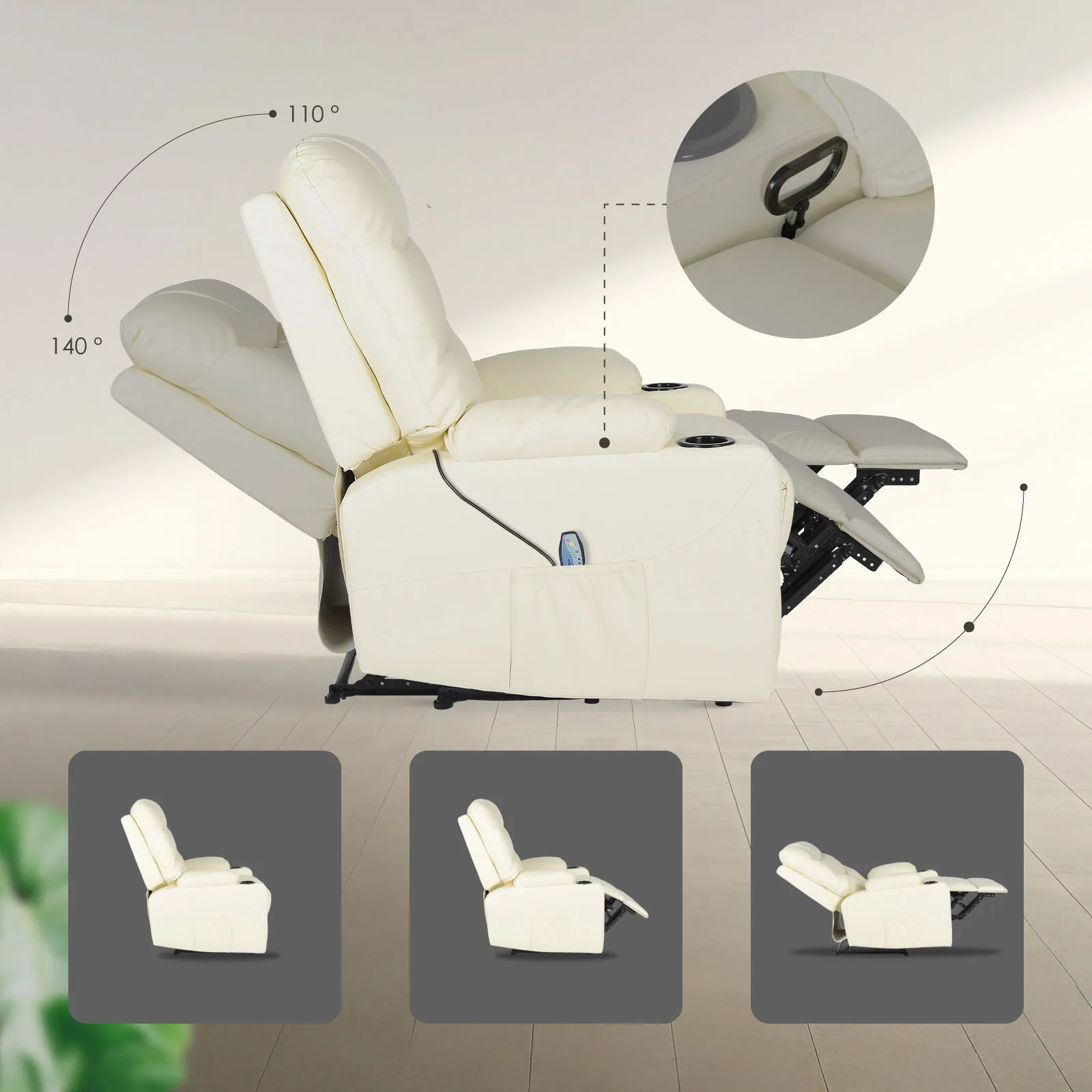 Built-in massage targets key points with soothing vibration modes including pulse, wave and auto, so you can tune into whatever your body needs. A side pocket keeps books, remotes or small comforts close by so there is no need to get up once you are settled.