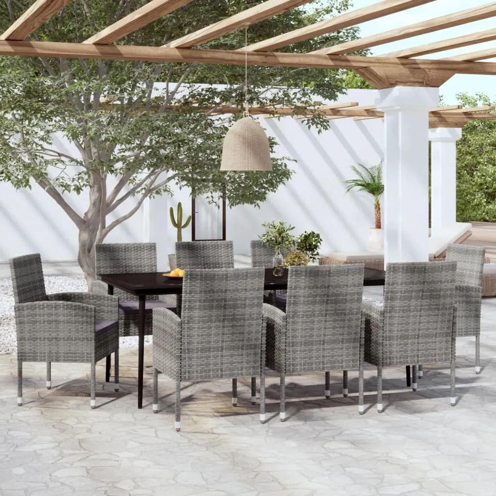 $938.55Enjoy a nice meal or afternoon tea in your outdoor space with this garden dining set! Featuring an elegant design, it will become the focal point of your garden and patio! The practical outdoor dining set has a steel frame, making it strong and sturdy. The garden chairs are made of water-resistant and maintenance-free PE rattan, making them perfect for outdoor use. The smooth glass tabletop is easy to clean with a damp cloth and excellent for placing meals, drinks and other decorative items. In addition, the thick, removable seat cushions are highly cosy. Note: In order to extend the life of your outdoor furniture, we recommend you to clean it regularly and do not leave it outdoors without protection unnecessarily.Clean: Use a mild soap solution.Storing: If possible, store in a cool, dry place indoors. If the product is stored outdoors, protect it with a waterproof cover. Wipe and dry the excess water or snow from flat surfaces after a rain or snowfall. Allow sufficient air circulation to avoid moisture-related damage.