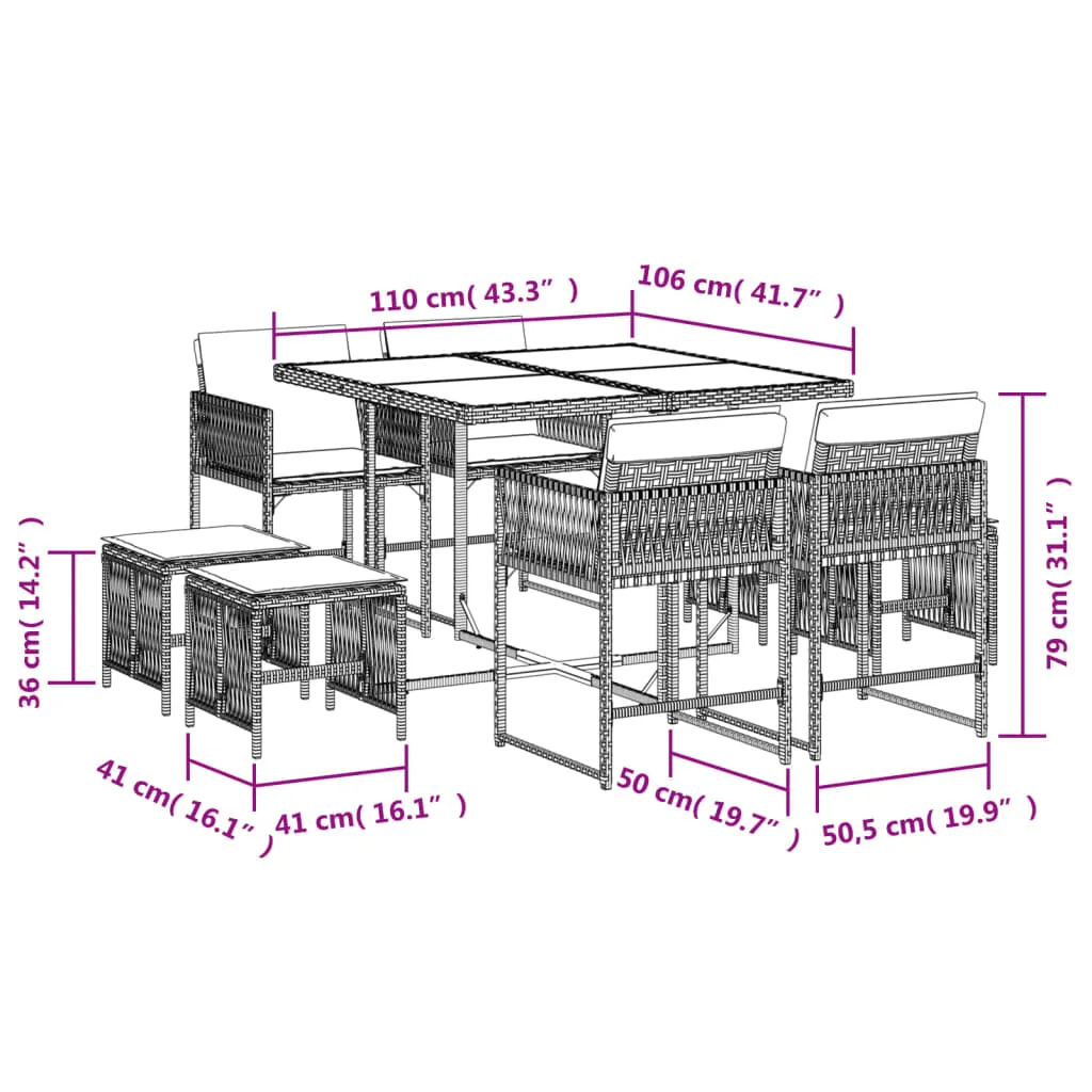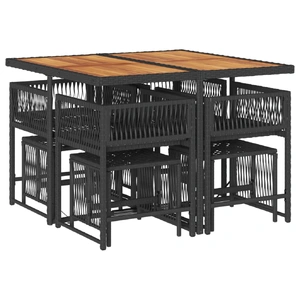 This garden dining set is a great choice for al fresco dining or just relaxing in the garden, backyard, or on the patio. Durable material: PE rattan, also known as poly rattan, is a strong, low-maintenance synthetic material that looks like natural rattan. It's lightweight, easy to clean, and commonly used for outdoor furniture due to its durability and weather-resistant properties.Compact storage: These chairs have a flap backrest that can be folded down, making it easy to store them under the table. When folded, they neatly fit under the table, forming a space-saving cube shape. Additionally, the stools can also be stored under the chairs, further maximizing space efficiency.Comfortable seat experience: This outdoor furniture, complete with thickly padded cushions, offers a comfortable seating experience.Removable and washable cover: These seat cushions feature removable covers for easy washing and maintenance. The cushion covers have a flap at the back for easy attachment to the backrests.Stable and easy-to-clean tabletop: This garden table has an acacia wood top that is sturdy, durable, and easy to clean with a damp cloth. Good to know:To make sure your outdoor furniture stays beautiful, we recommend protecting it with a waterproof cover.